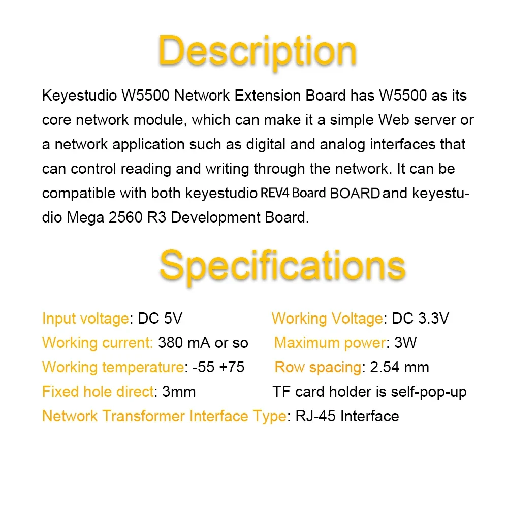 You can quickly make your controller access to internet to build your network application.At the same time, it also supports mini SD card(TF card, maximum storage 1G) read and write.You can direct stack the W5500 Network shield onto control board, or stack other expansion boards on this Network shield.The shield has four 3mm fixing holes, easy to mount on any other devices