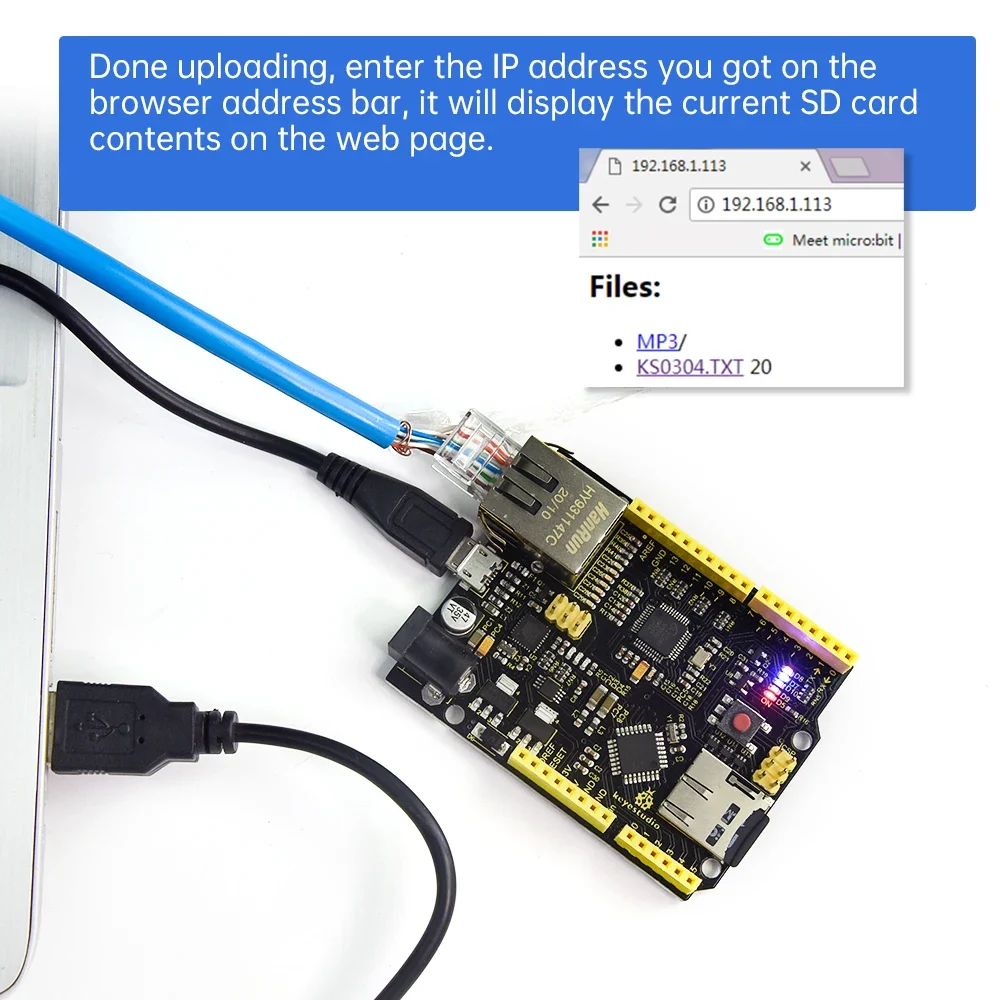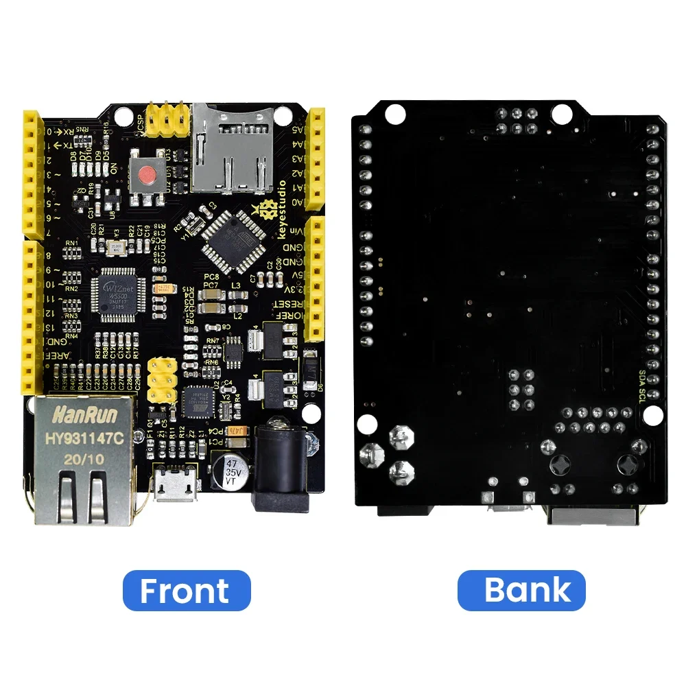 It can make as simple Web server, or write and read the High/Low level of digital pins, or analog value of analog pins via network control.It is compatible with both keyestudio UNO R3 and Mega 2560 R3 development board.