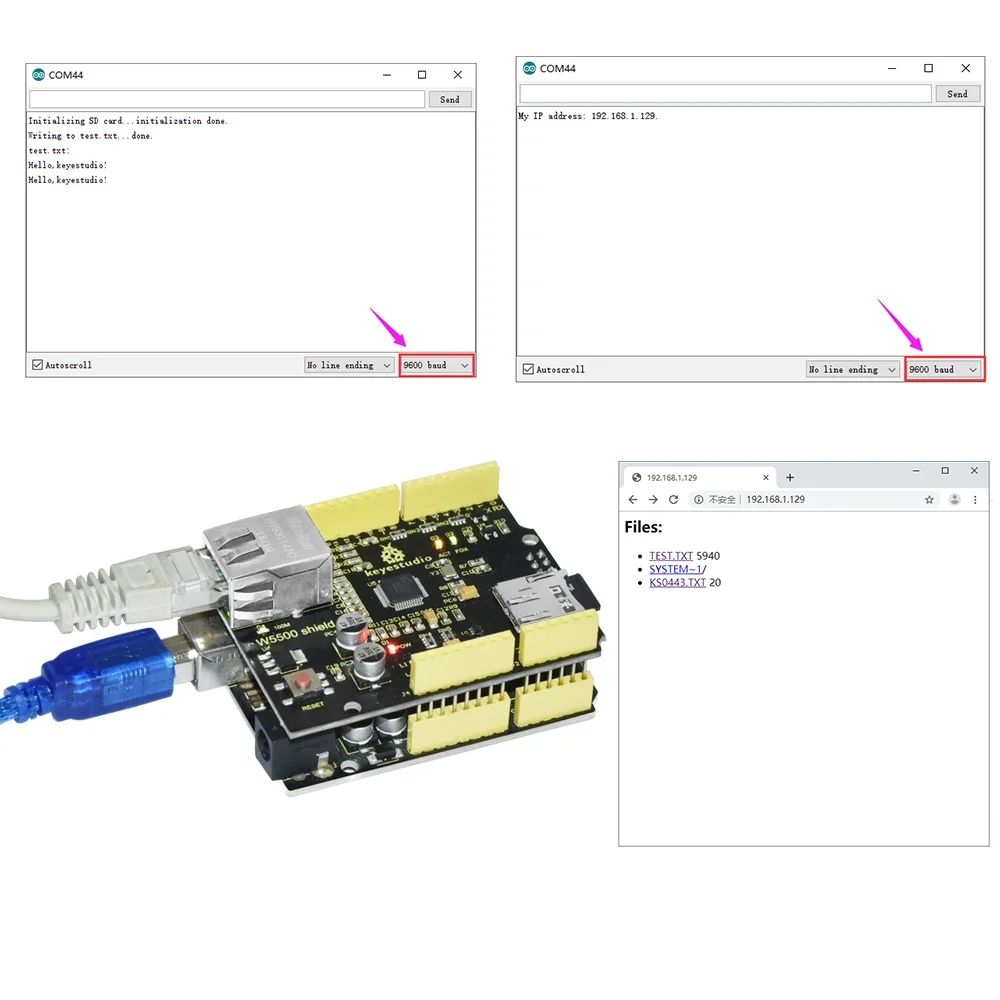 When using, stack the W5500 shield onto UNO board, and upload the program to control board, which can make a simple Web server.