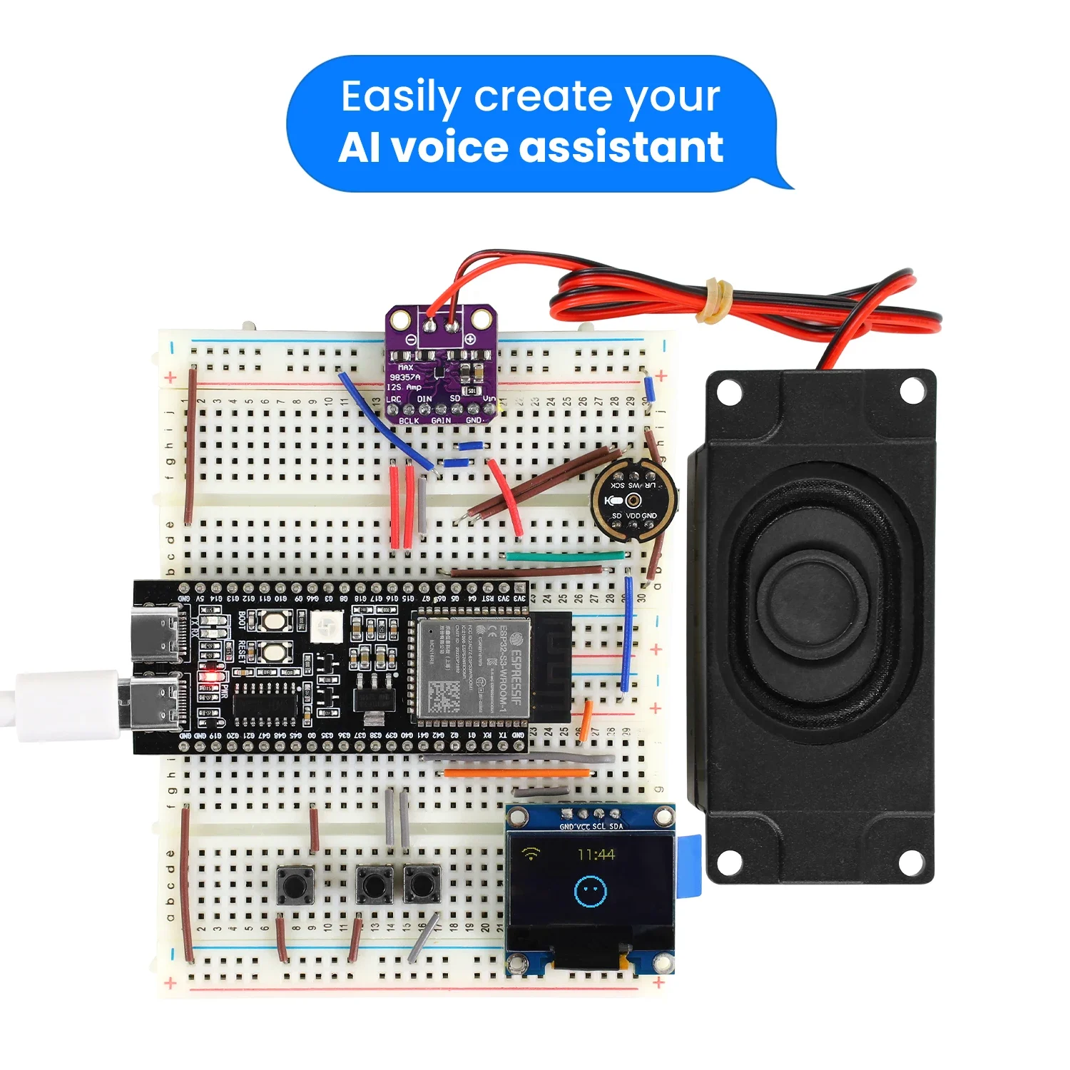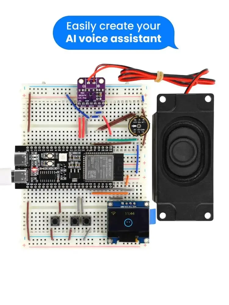 هذه مجموعة DIY تسمح لك ببناء نموذج أولي لـ “Xiao Zhi AI Chatbot” بسرعة على لوحة التجارب باستخدام أجهزة بسيطة وتقنية التعرف على الكلام.يتضمن مكونات رئيسية مثل لوحة التطوير ESP32-S3-DevKitC-1، وميكروفون MEMS الرقمي (INMP441)، ومضخم الصوت الرقمي (MAX98357A)، وشاشة OLED مقاس 128 × 64، ومكبر صوت تجويفي، الذي يدعم إدخال الصوت وتشغيله.توجد واجهات محجوزة لمزيد من التوسع، مما يتيح وظيفة التفاعل الأساسية بين الإنسان والآلة.
