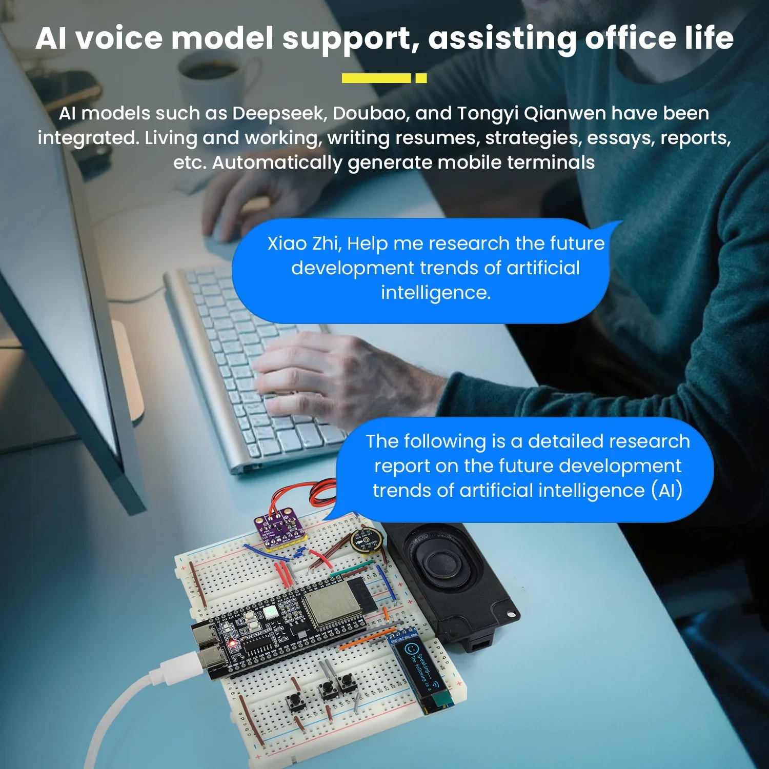 هذه مجموعة DIY تسمح لك ببناء نموذج أولي لـ “Xiao Zhi AI Chatbot” بسرعة على لوحة التجارب، باستخدام أجهزة بسيطة وتقنية التعرف على الكلام.يتضمن مكونات رئيسية مثل لوحة التطوير ESP32-S3-DevKitC-1، وميكروفون MEMS الرقمي (INMP441)، ومضخم الصوت الرقمي (MAX98357A)، وشاشة OLED مقاس 128 × 32، ومكبر صوت تجويفي، يدعم إدخال الكلام وتشغيله، مع واجهات محجوزة لمزيد من التوسع لتحقيق وظيفة التفاعل الأساسية بين الإنسان والآلة.