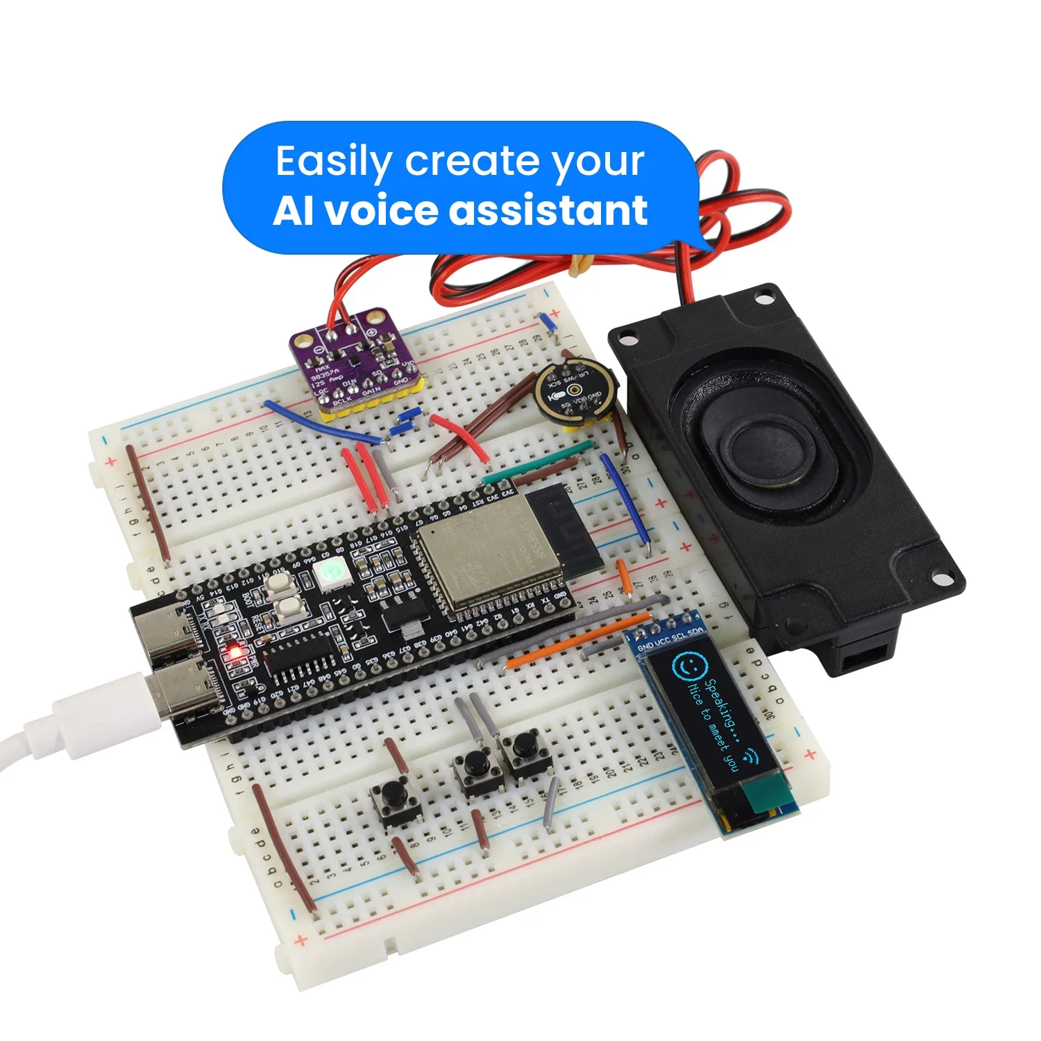 • إخراج الصوت: يوفر مزيج مكبر الصوت الرقمي (MAX98357A) ومكبر الصوت التجويفي تشغيلًا واضحًا للكلام.