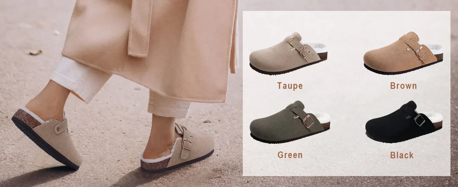 CLASSIC CORK CLOGS: 100% genuine suede look with adjustable metal buckle straps. They are super flattering with spring/summer outfits. Perfect all seasons wardrobe staple. You will get so many compliments when you wear them
