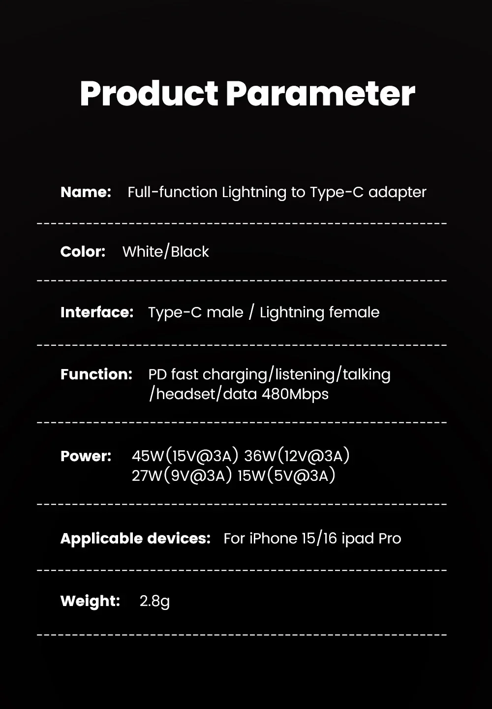 Lightning To USB Type C Adapter Support Call Music Recording Carplay 45W Fast Charging Data Transfer Type C To Lightning Adapter