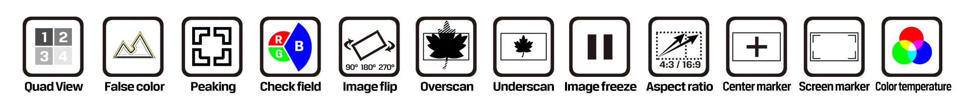 F1 and F2 user-definable buttons to custom auxiliary functions as shortcut, such as peaking, underscan and checkfield. Use the