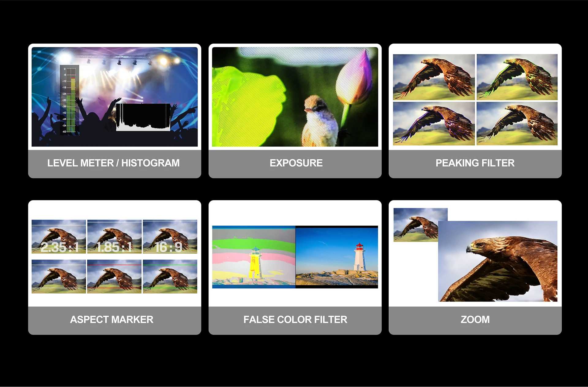 A11 provides plenty of auxiliary functions for taking photos and making movies, such as peaking, false color and audio level meter.