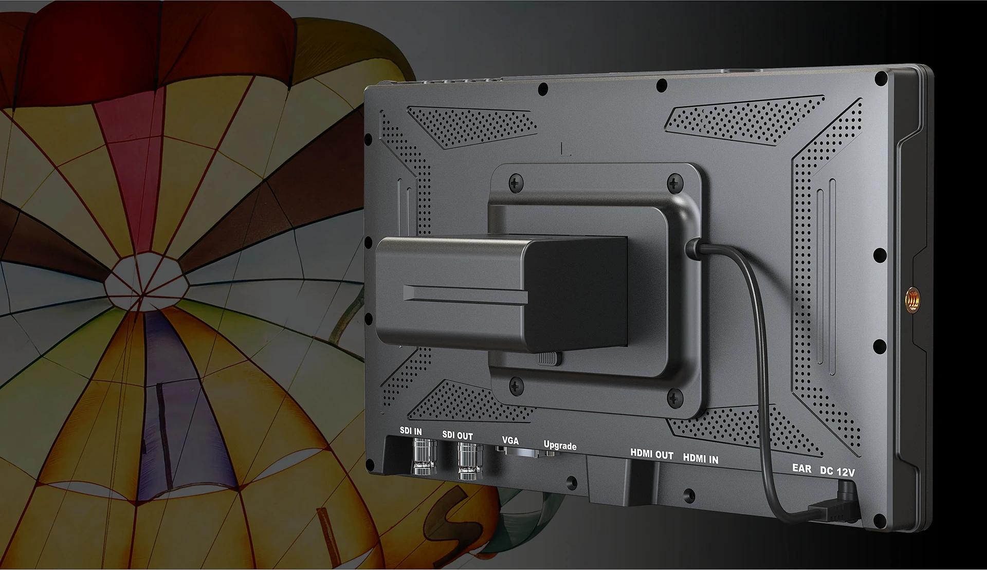 VESA 75mm mount design allows A11 to power up with a external SONY F-series battery on its back.F970 can
