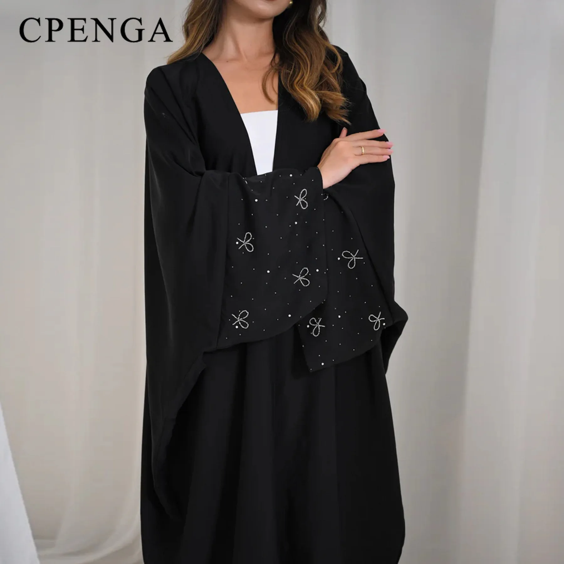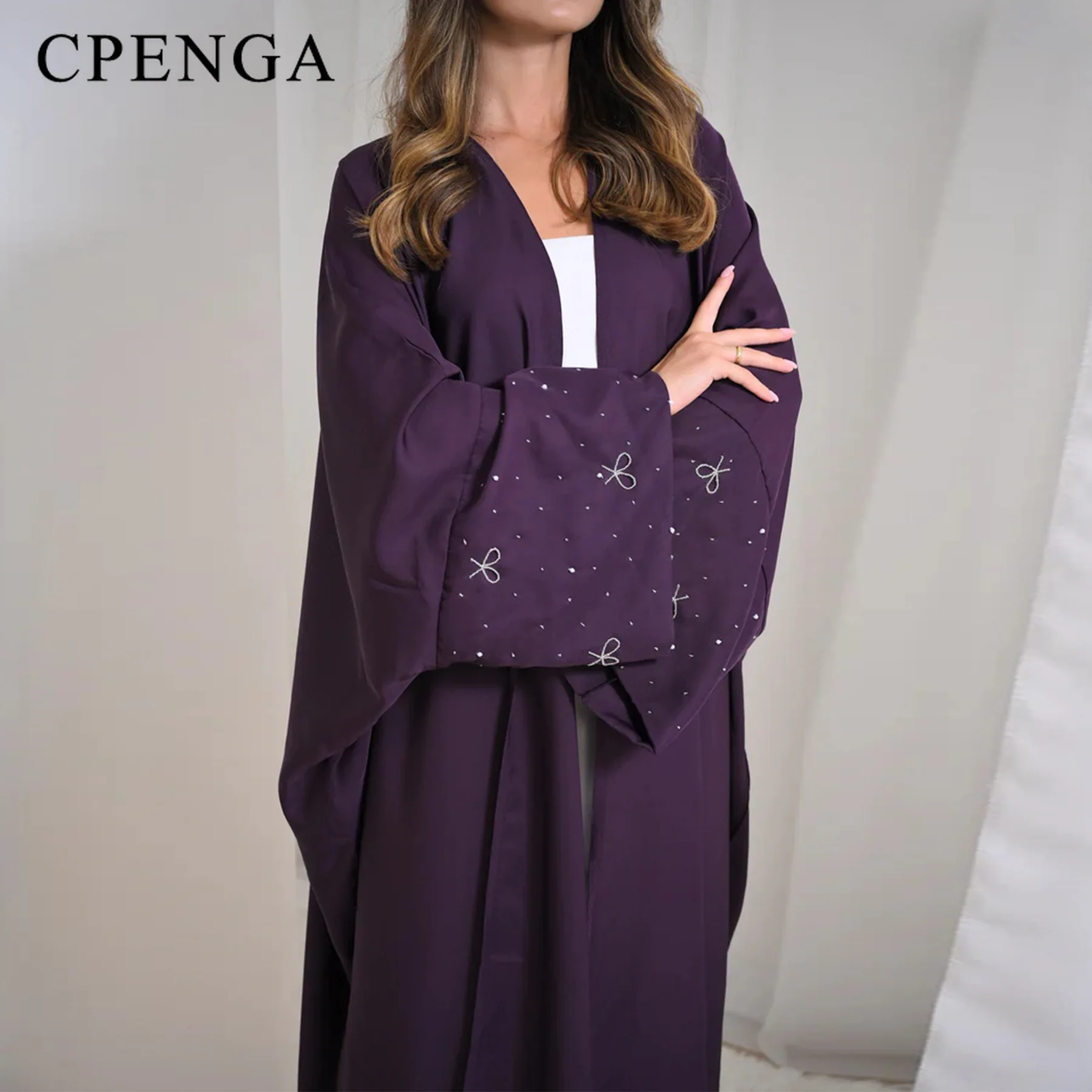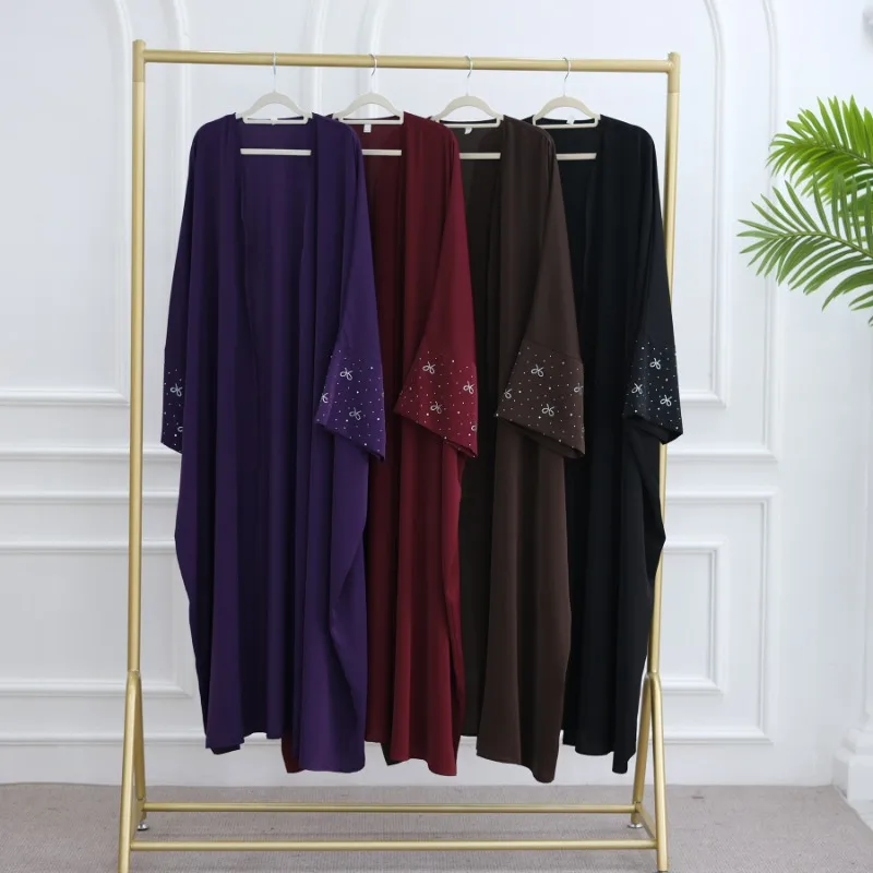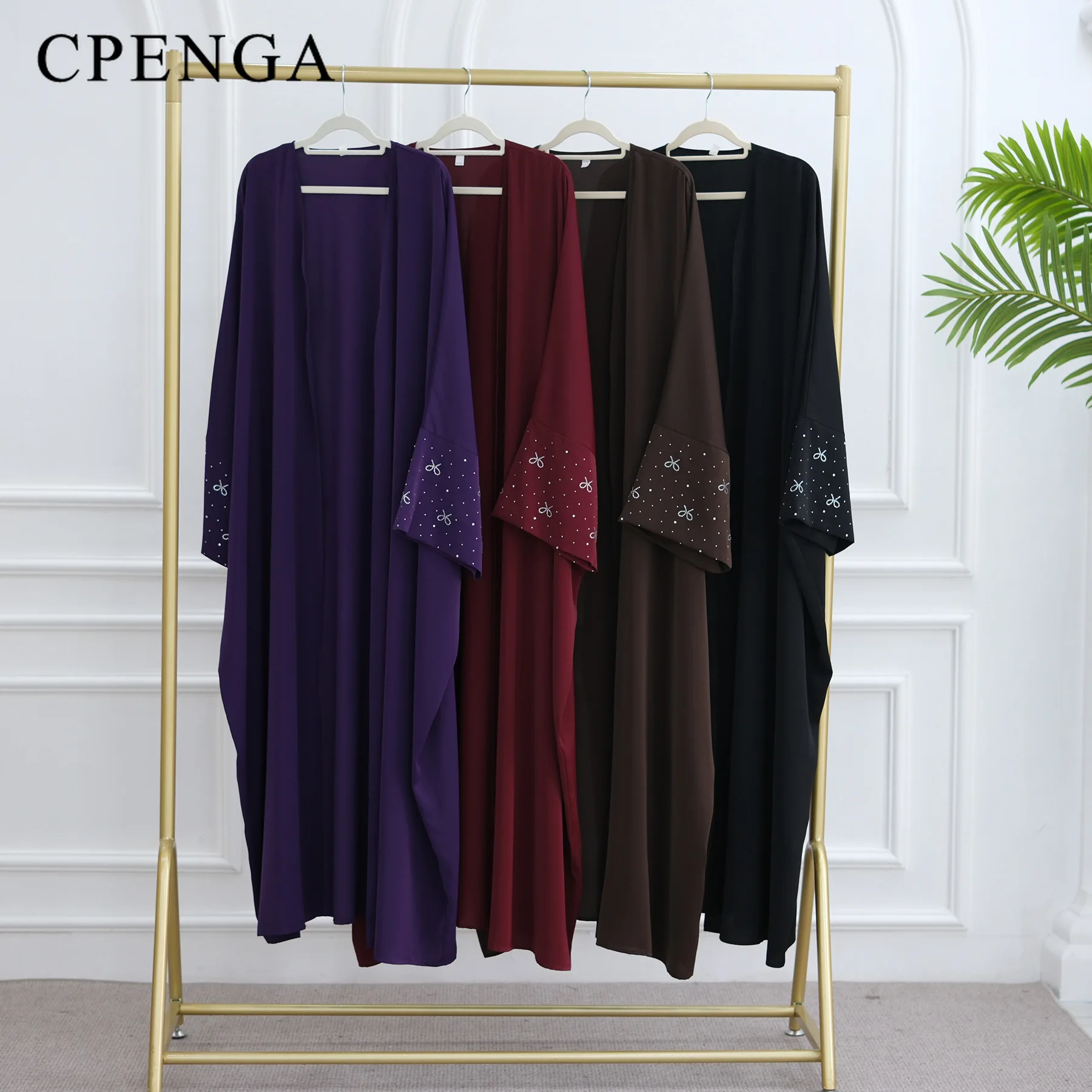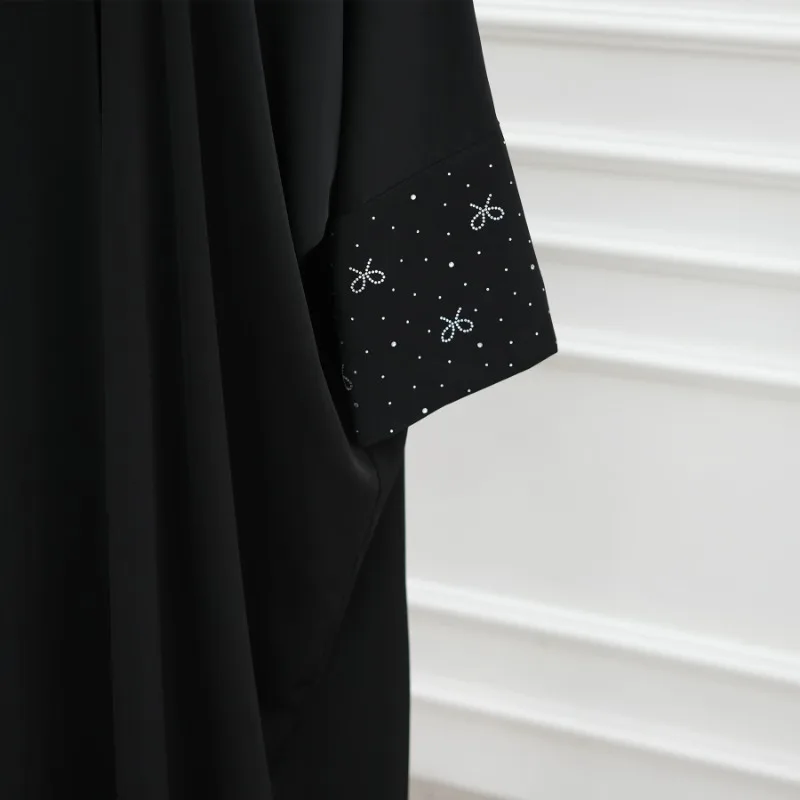 Luxury Dubai Abaya with Beaded Bow Modest Dress for Muslim Women Elegant Open Front Cover Cardigan Fashion Plain Turkey Outfit