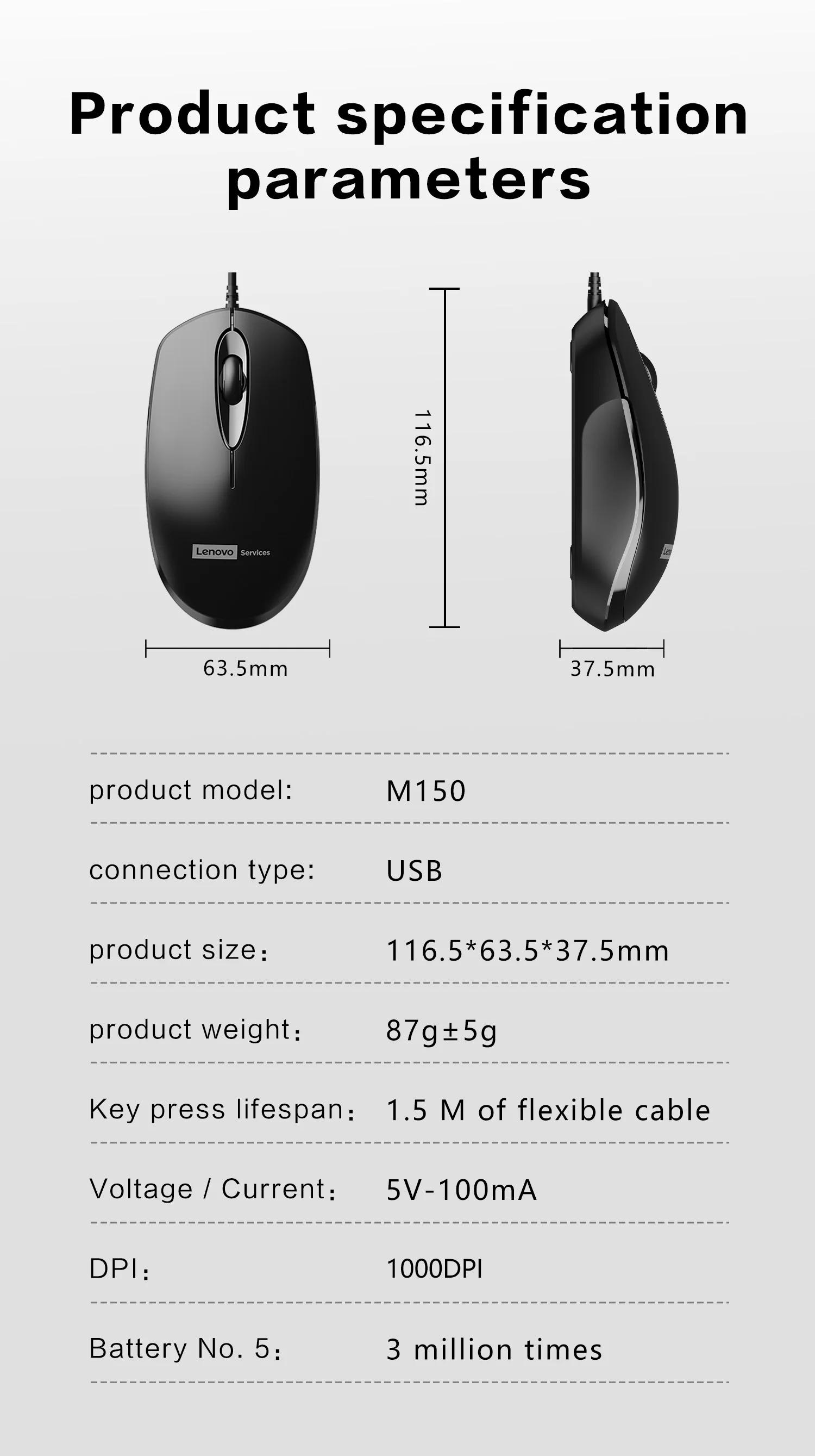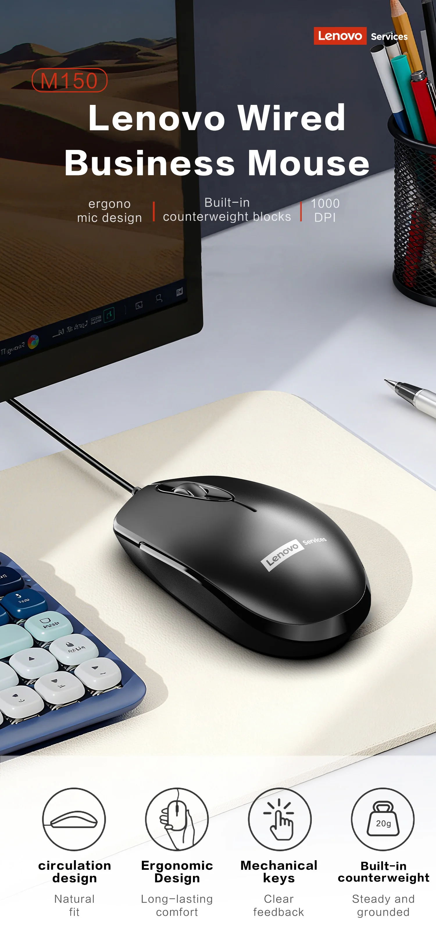 M150 Wired Mouse, Ergonomic Design USB-Powered Durable Black Smooth Rolling Ideal for Office Home Laptop Desktop and PC Use