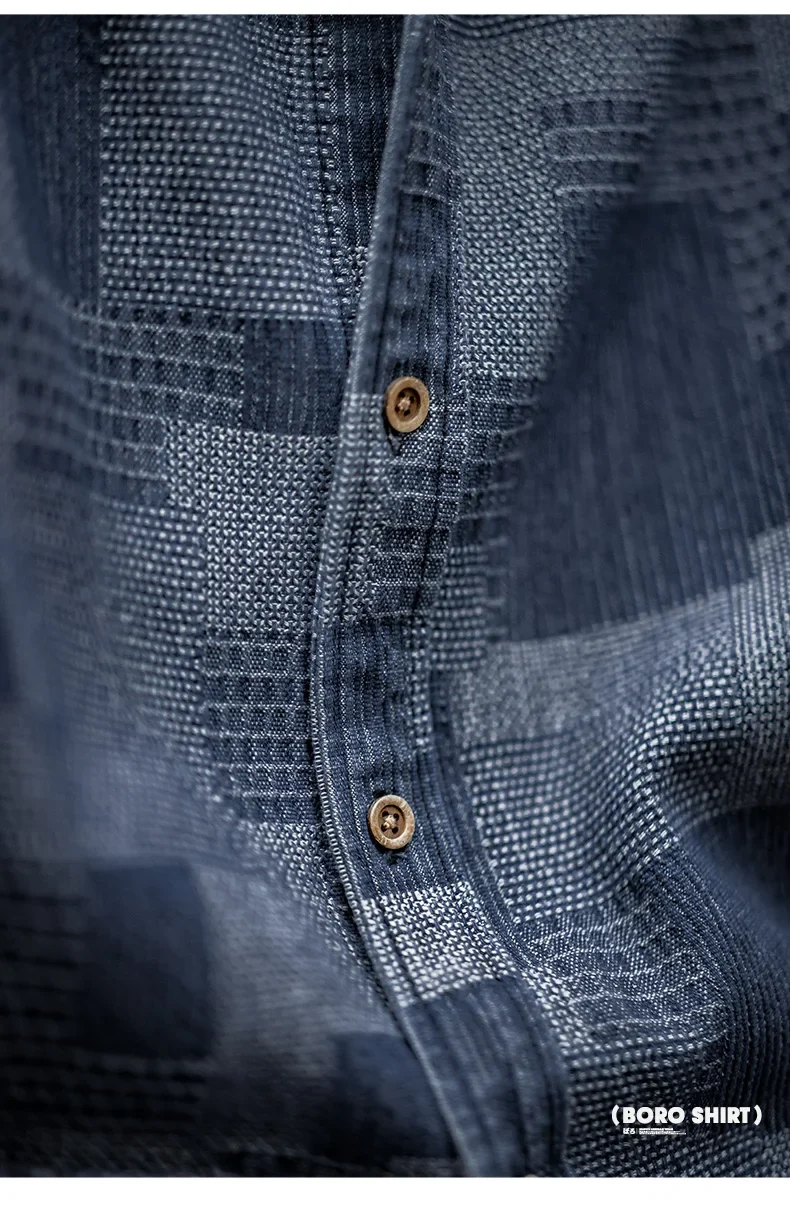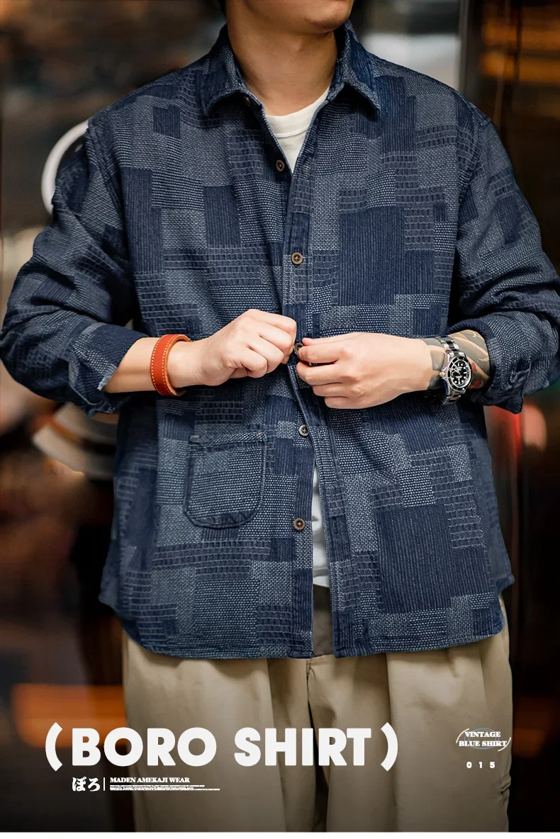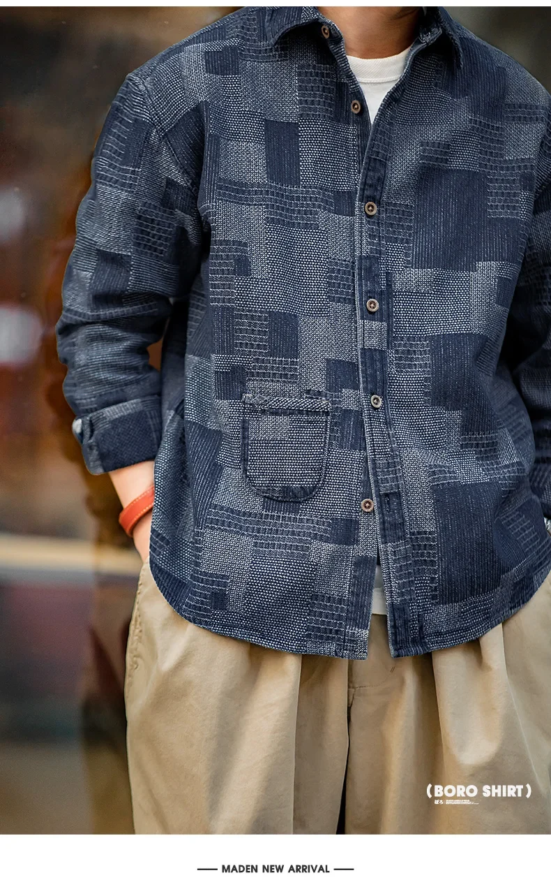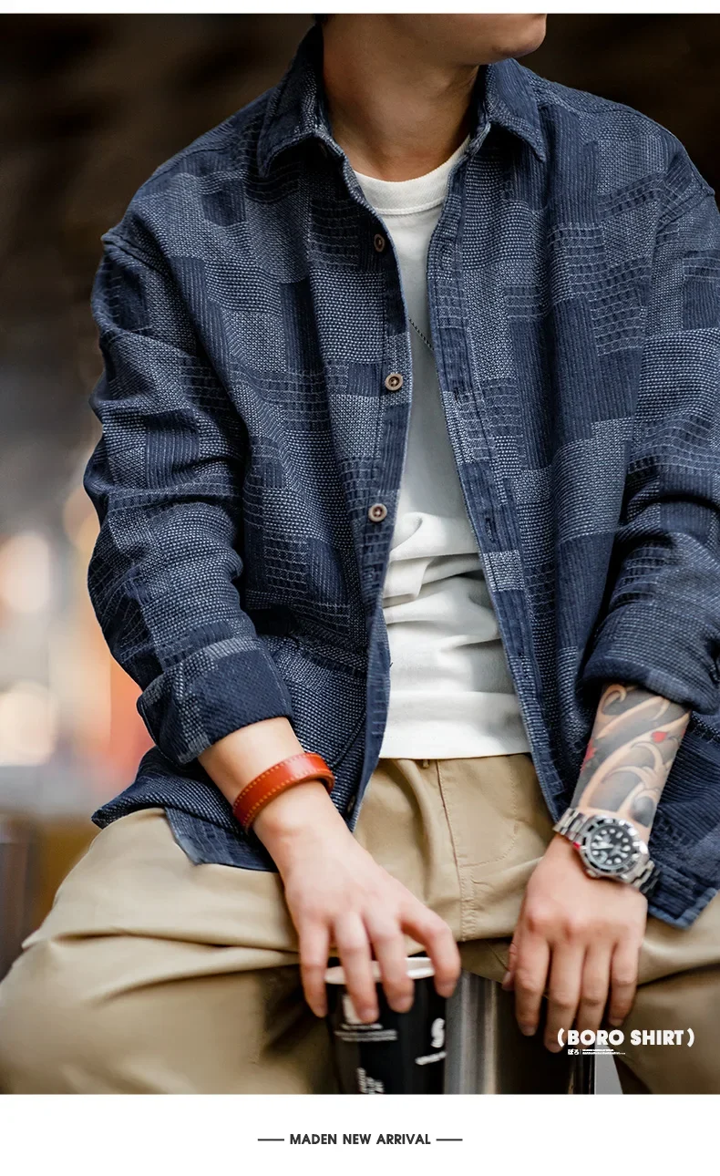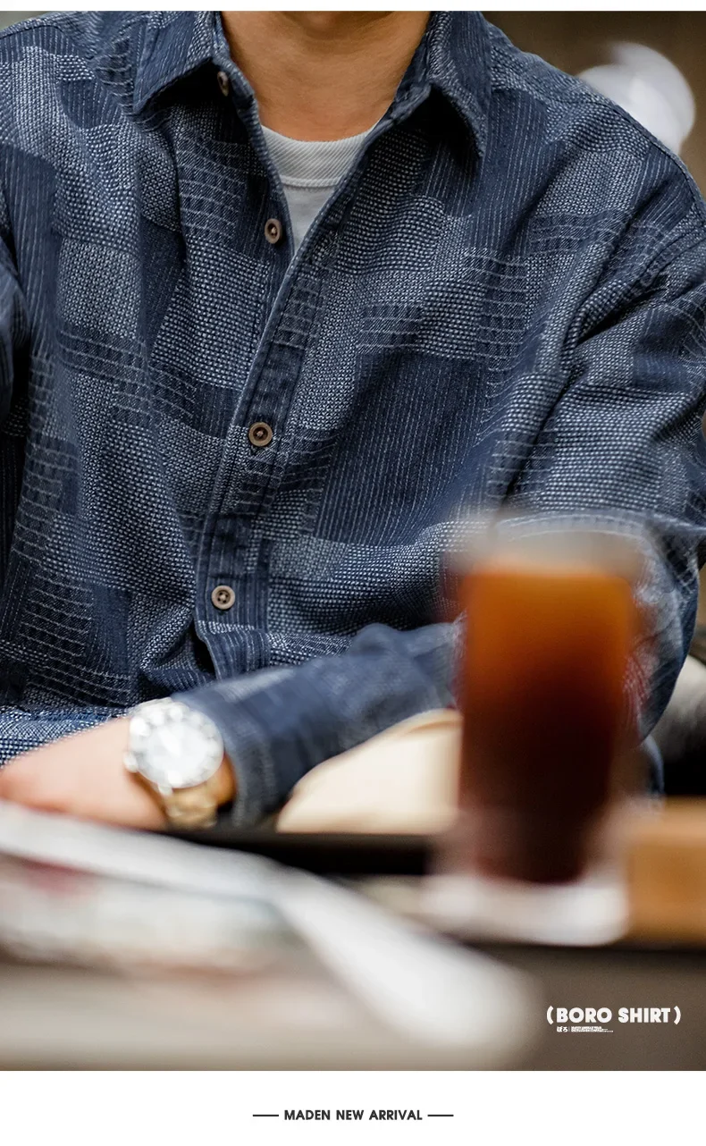 Maden Boro Style Vintage Blue Cloth Shirts for Men Plaid Patchwork Long Sleeve Shirts Regular Fit Top Daily Casual Wear