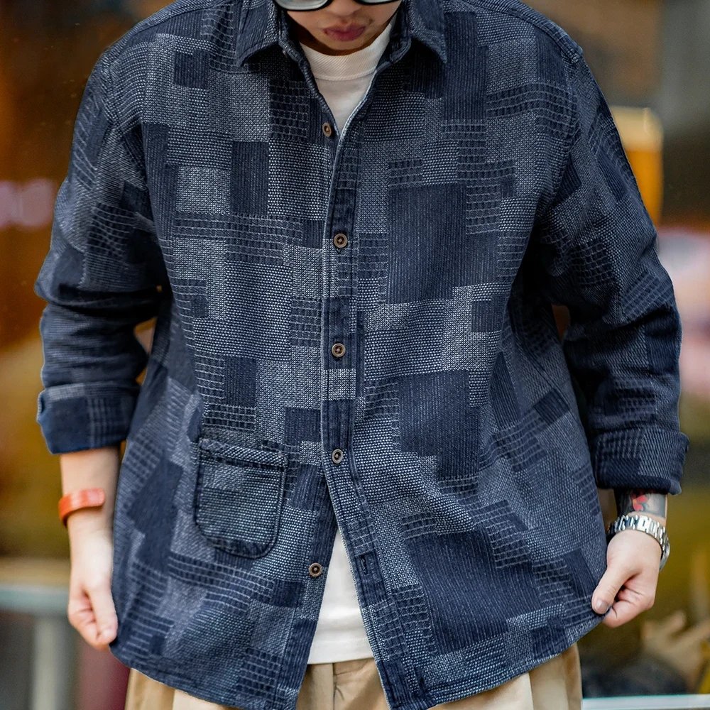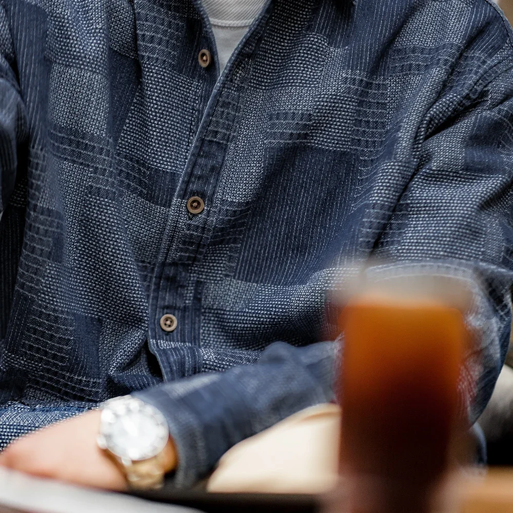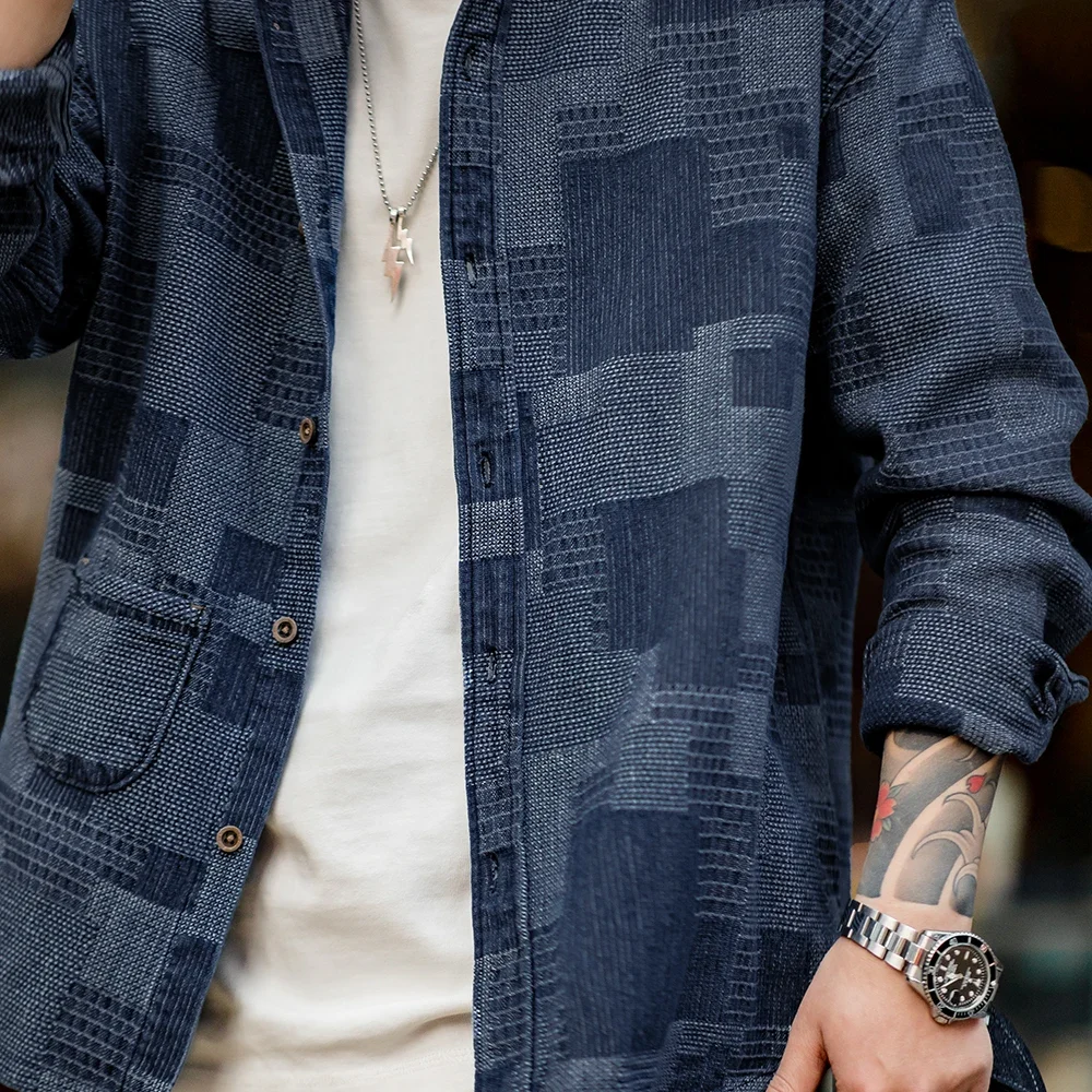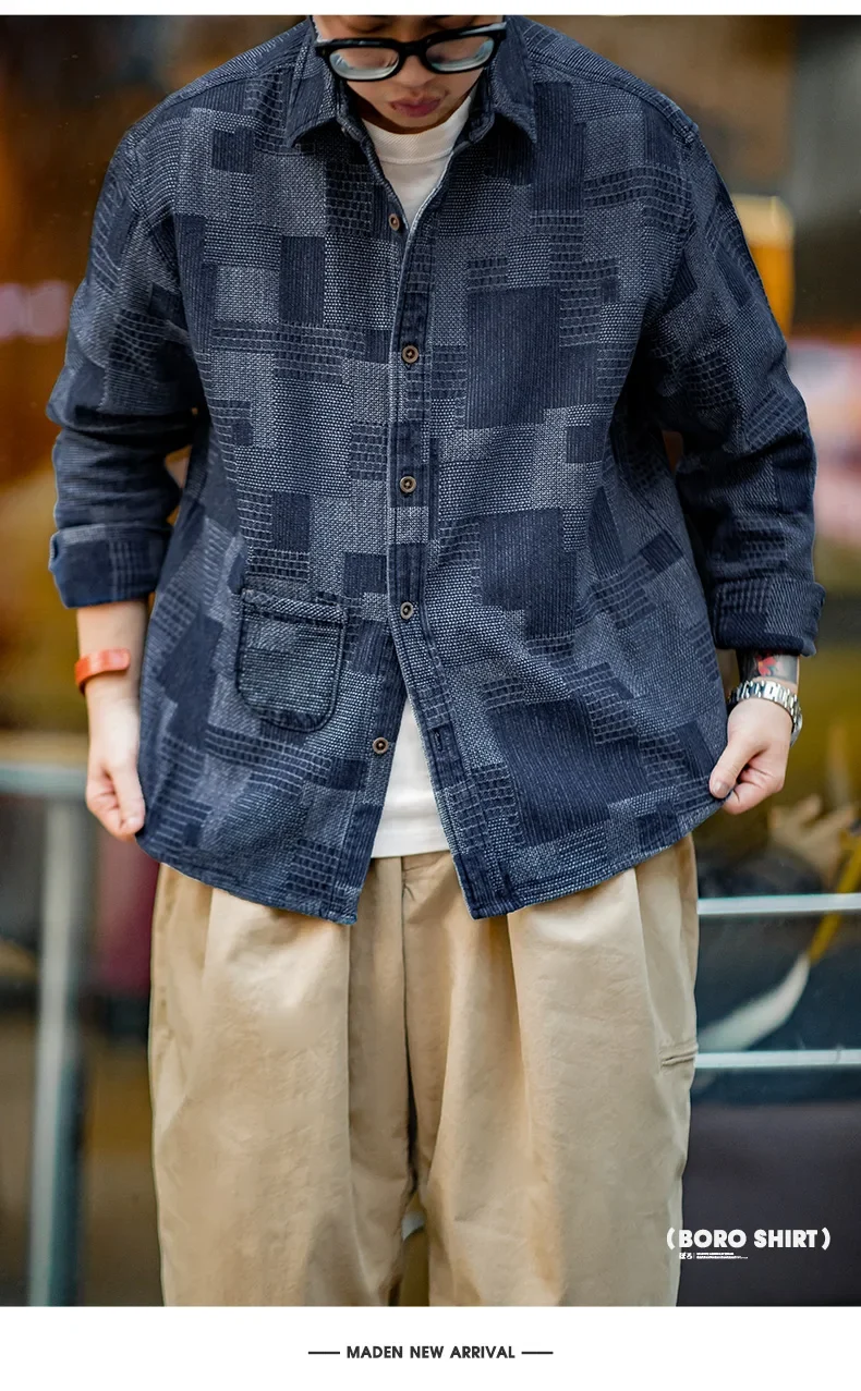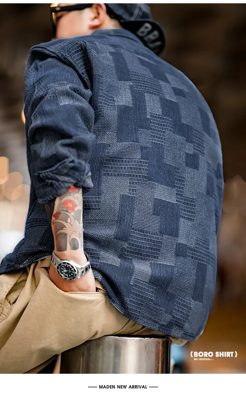 Maden Boro Style Vintage Blue Cloth Shirts for Men Plaid Patchwork Long Sleeve Shirts Regular Fit Top Daily Casual Wear