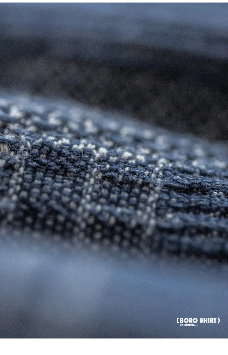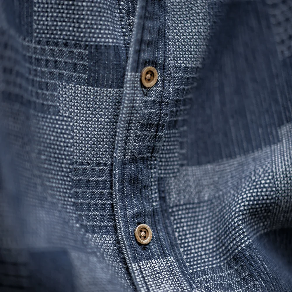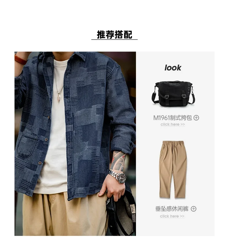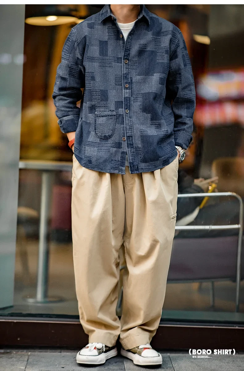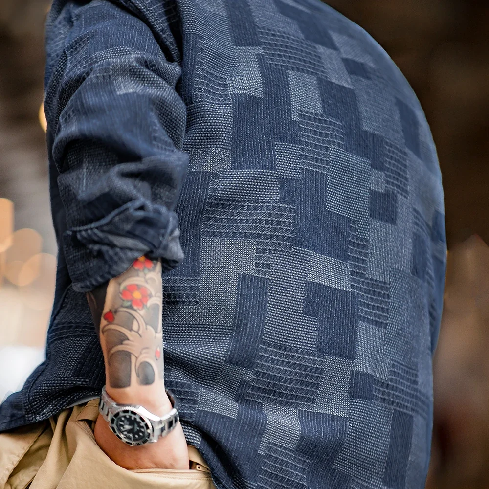 Maden Boro Style Vintage Blue Cloth Shirts for Men Plaid Patchwork Long Sleeve Shirts Regular Fit Top Daily Casual Wear