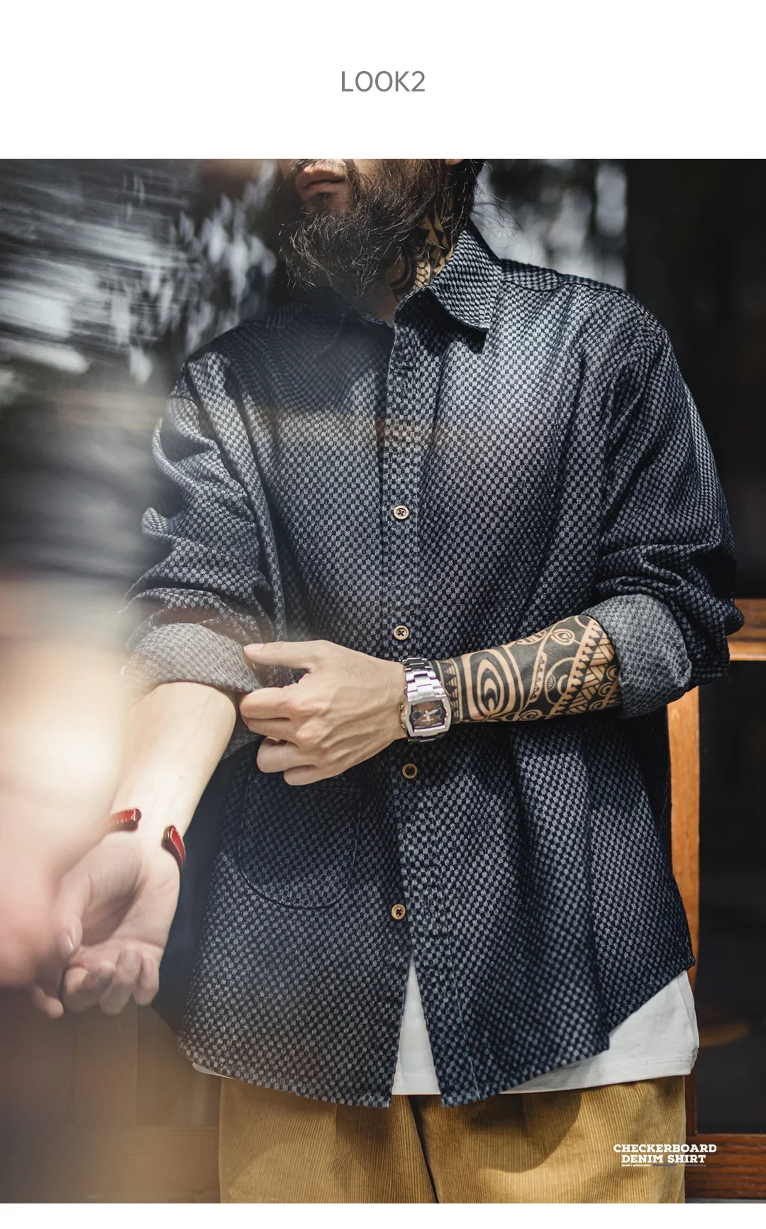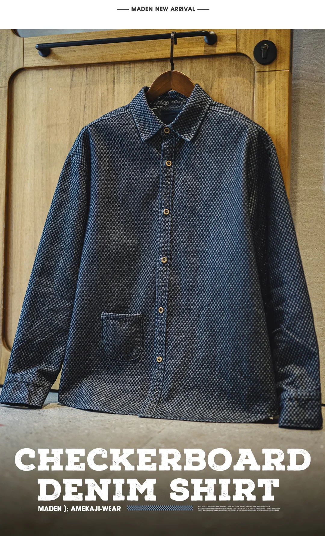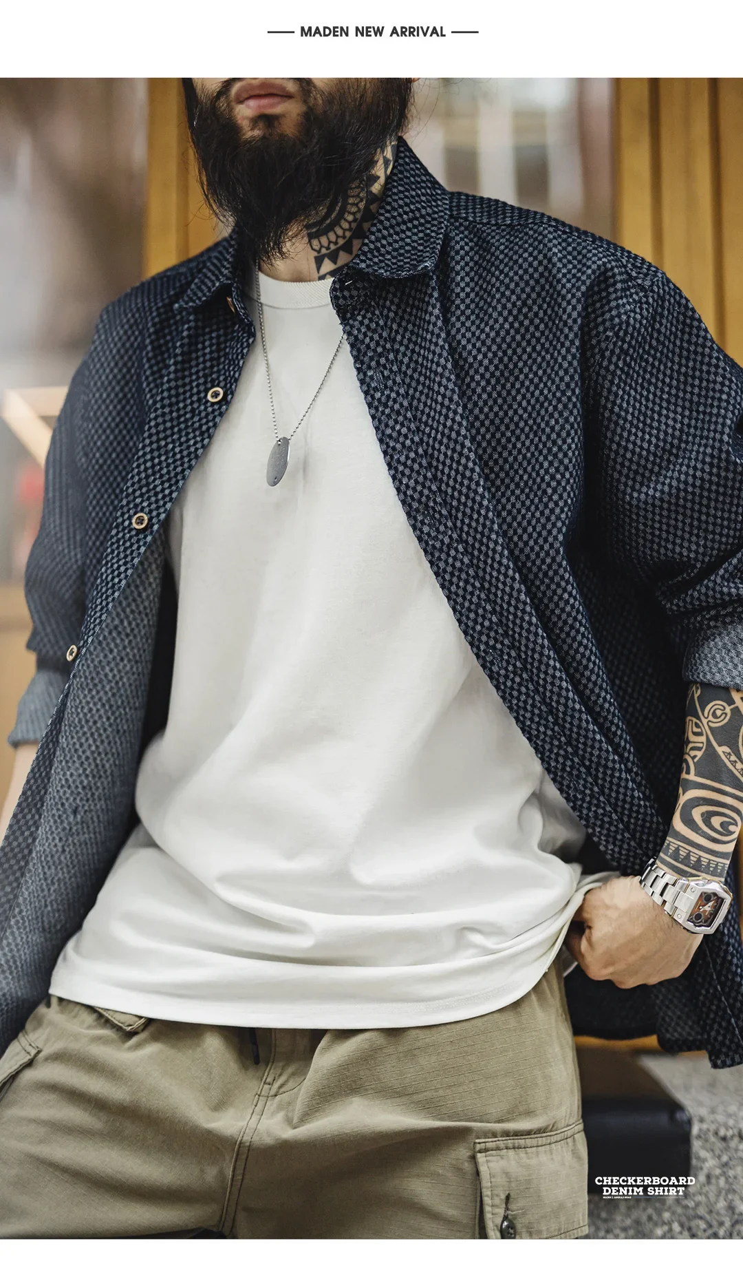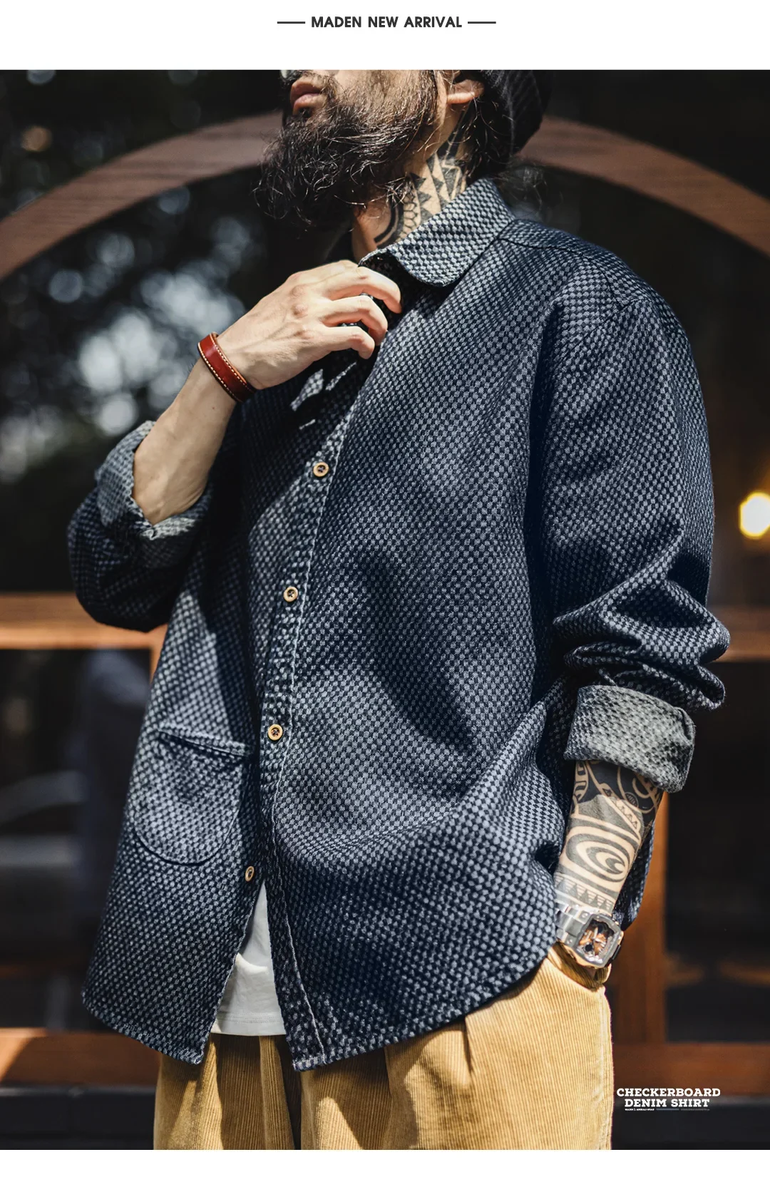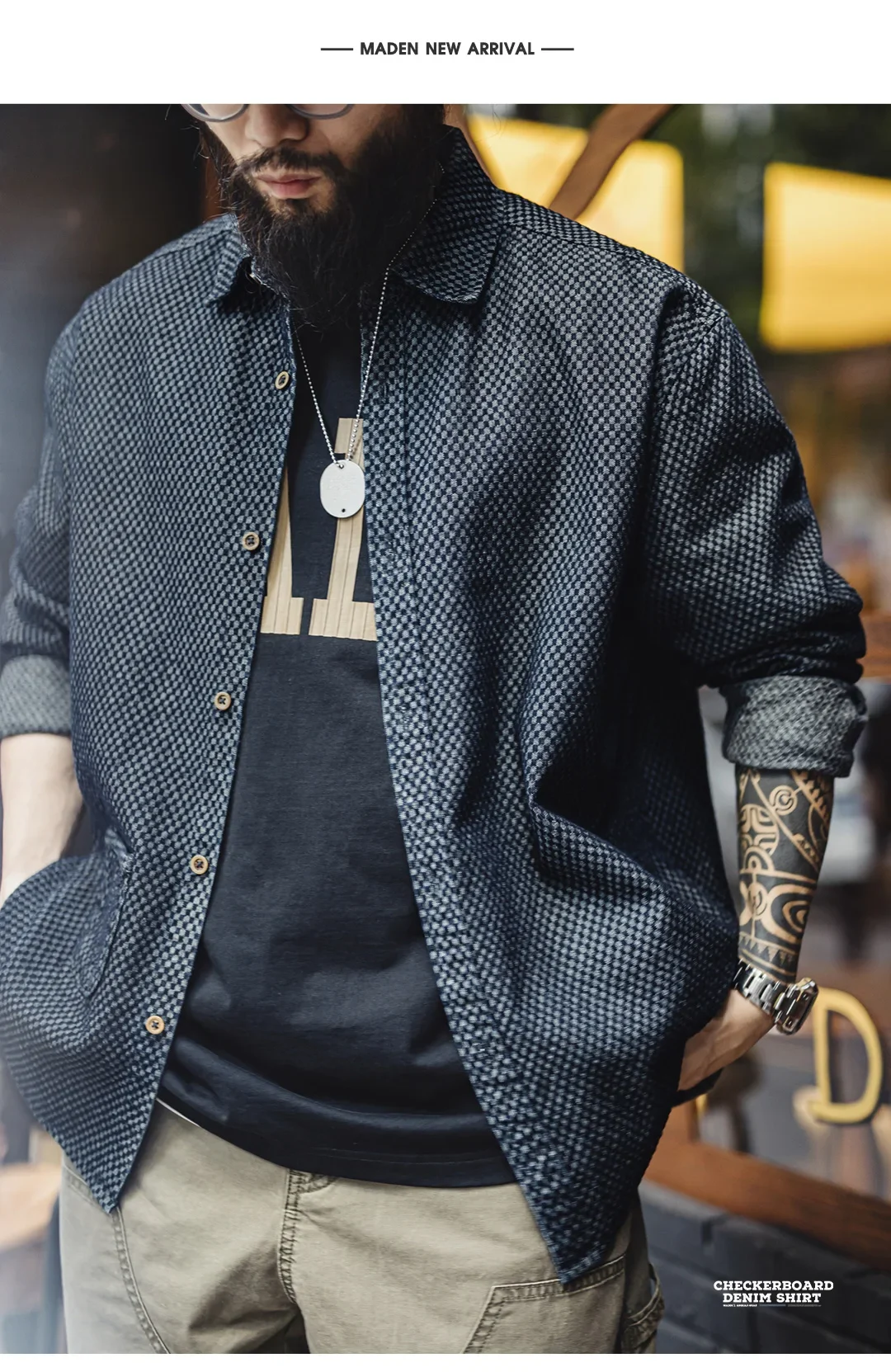 Maden Retro Checkered Long-sleeved Denim Shirt Loose Lapel Single-breasted Jacket for Men Spring and Fall Versatile Outerwear
