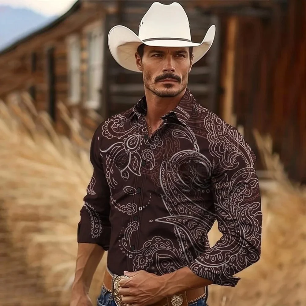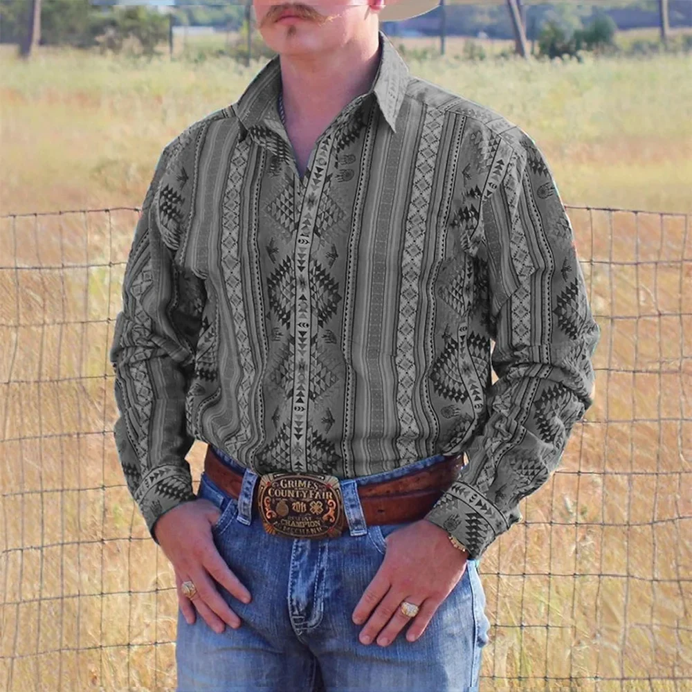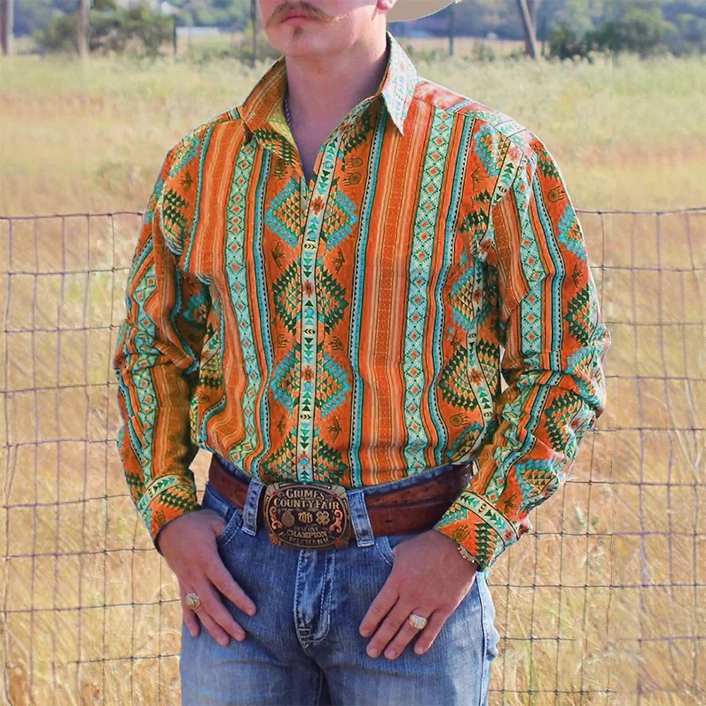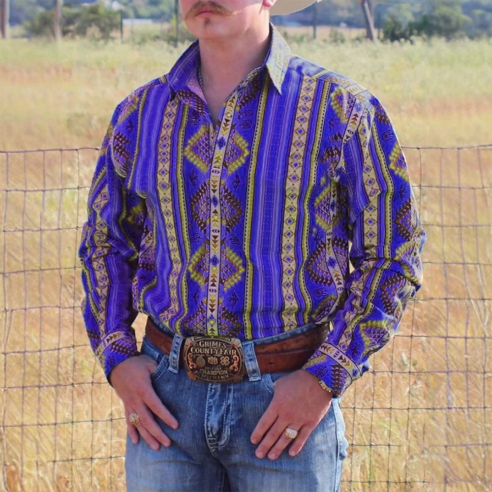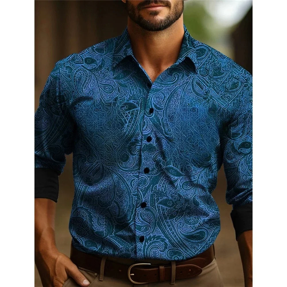 Men’s long-sleeved shirt Four seasons casual lapel button down shirt Men’s denim retro ethnic totem style breathable soft shirt