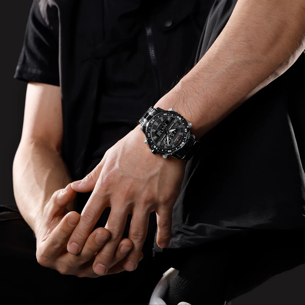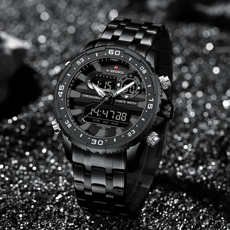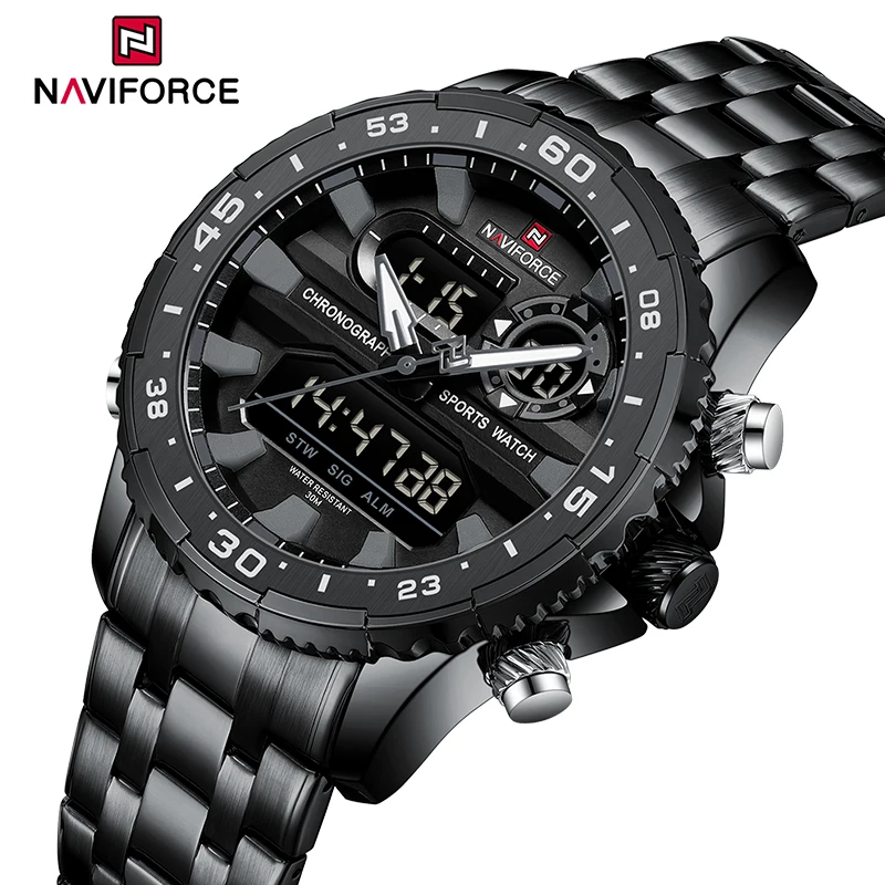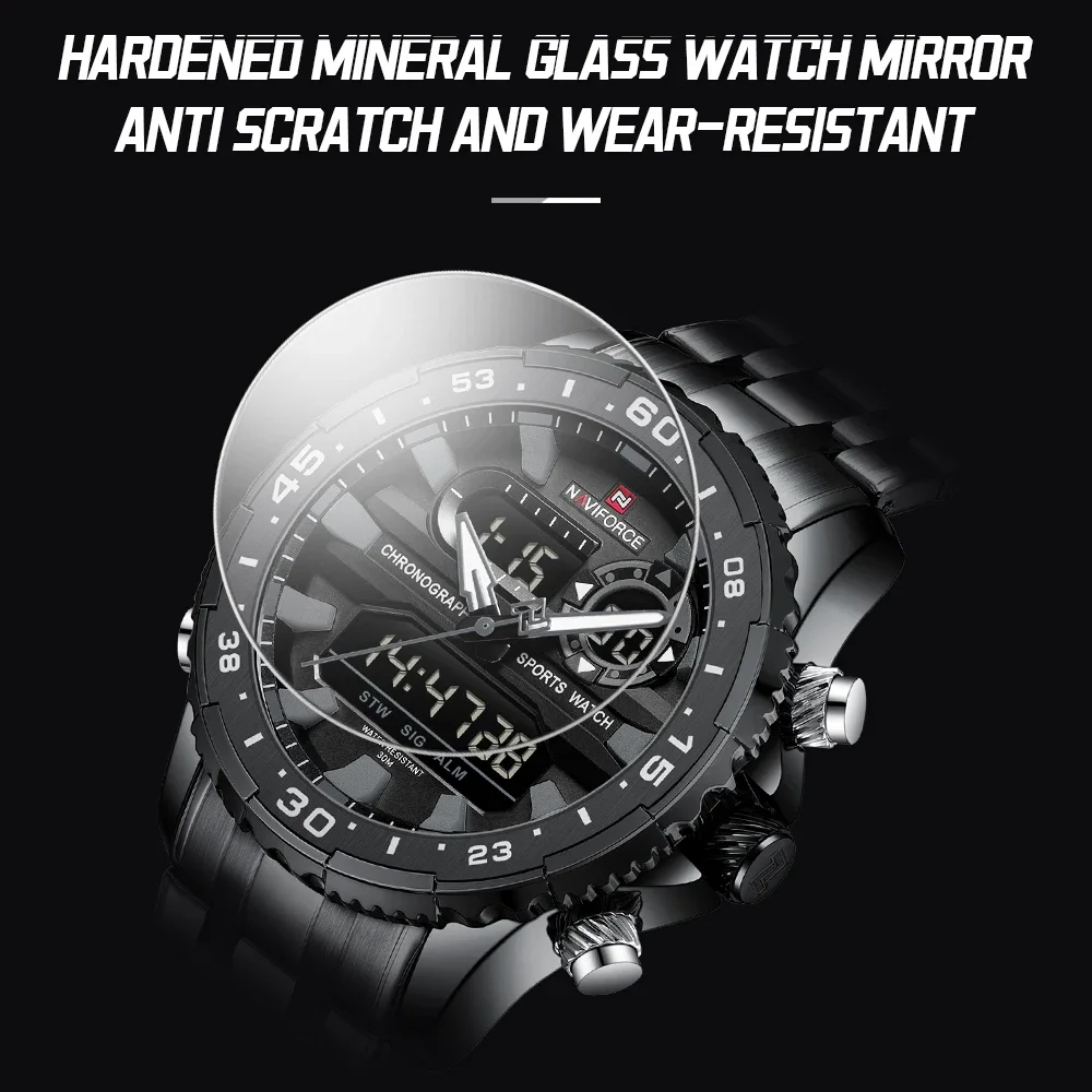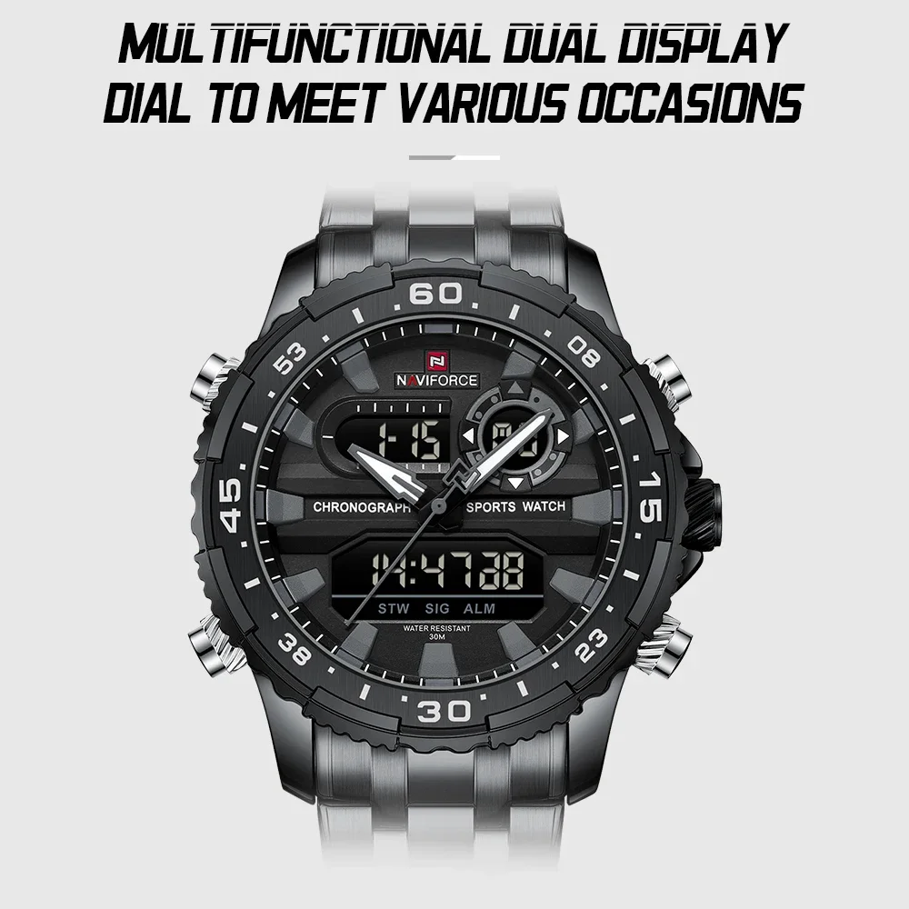 NAVIFORCE Men’s Watch Quartz Analog LCD Digital Wristwatch Male Stainless Steel Strap Water Resistant Date Clock Package Gifts
