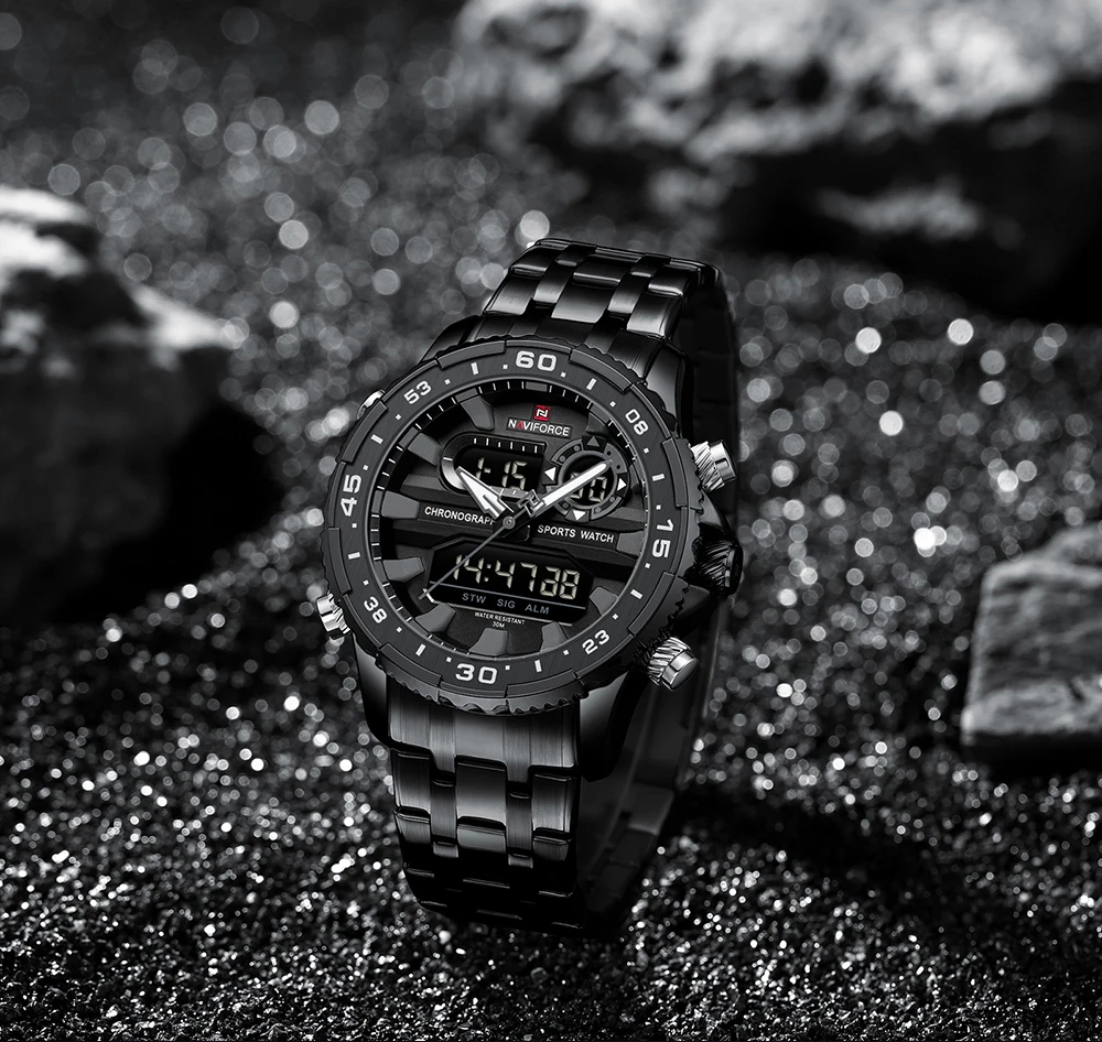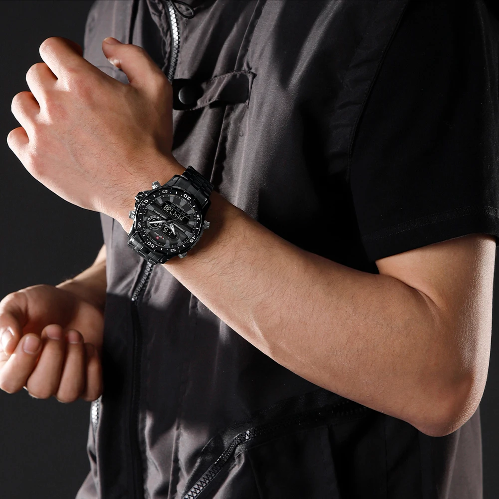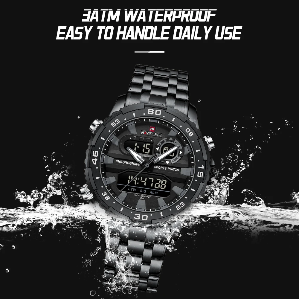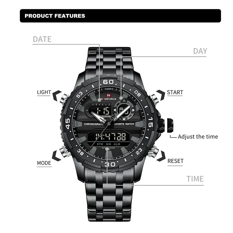 NAVIFORCE Men’s Watch Quartz Analog LCD Digital Wristwatch Male Stainless Steel Strap Water Resistant Date Clock Package Gifts