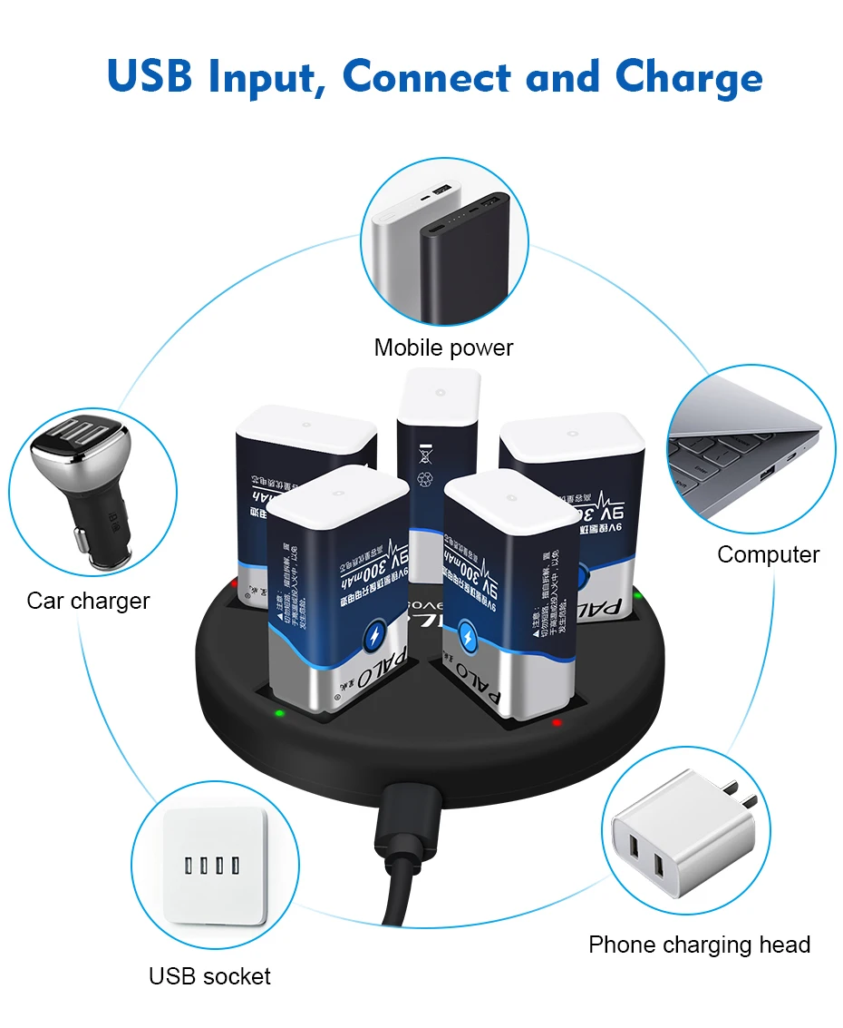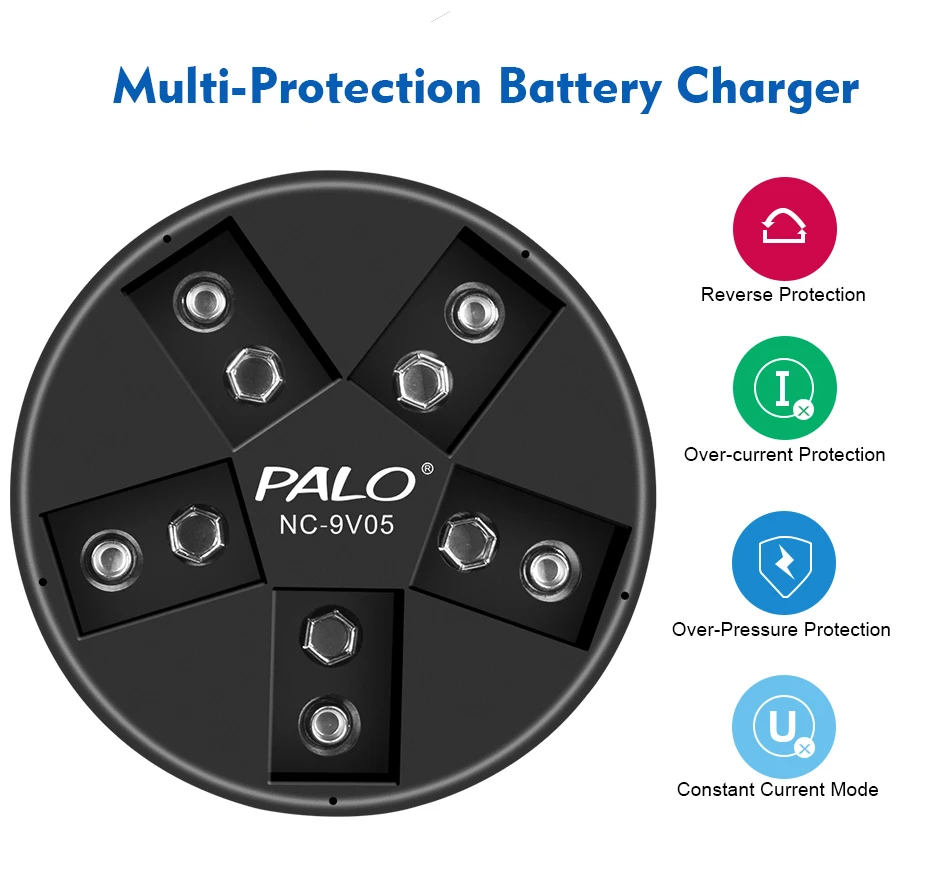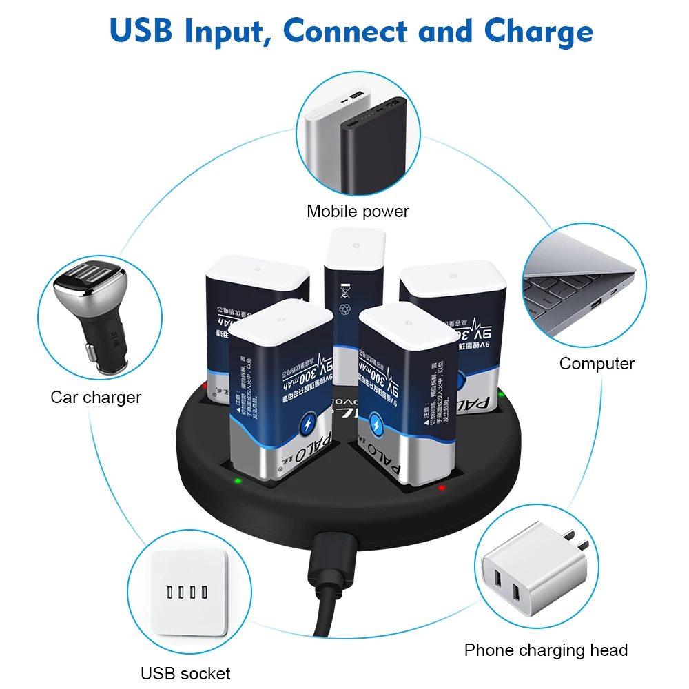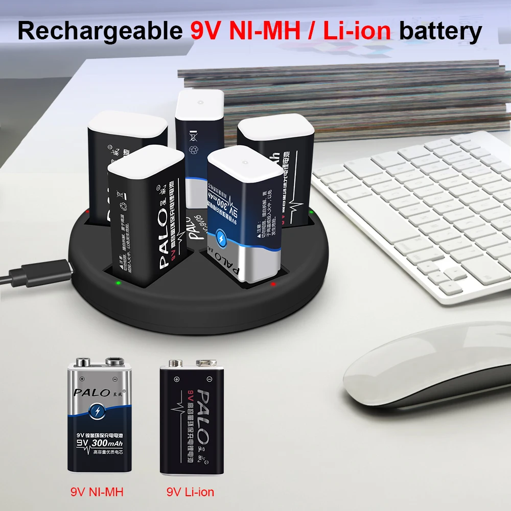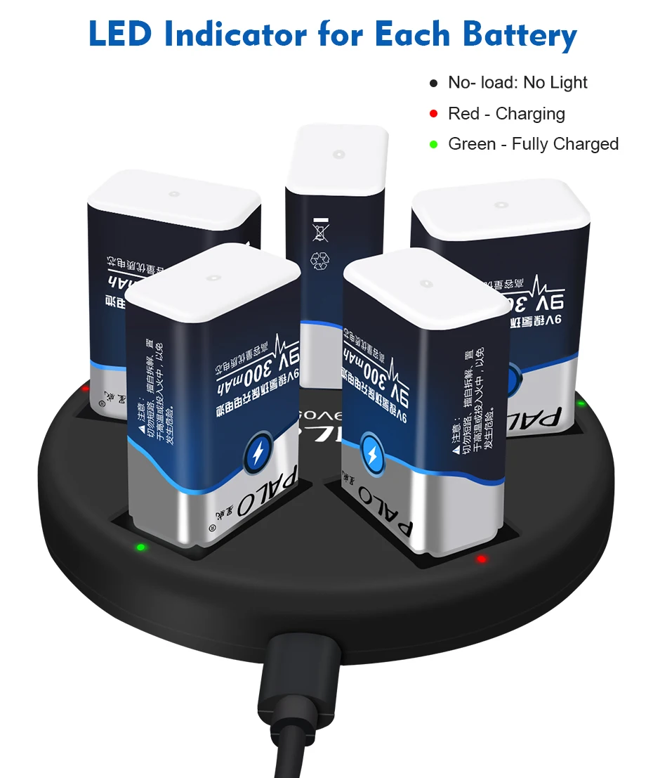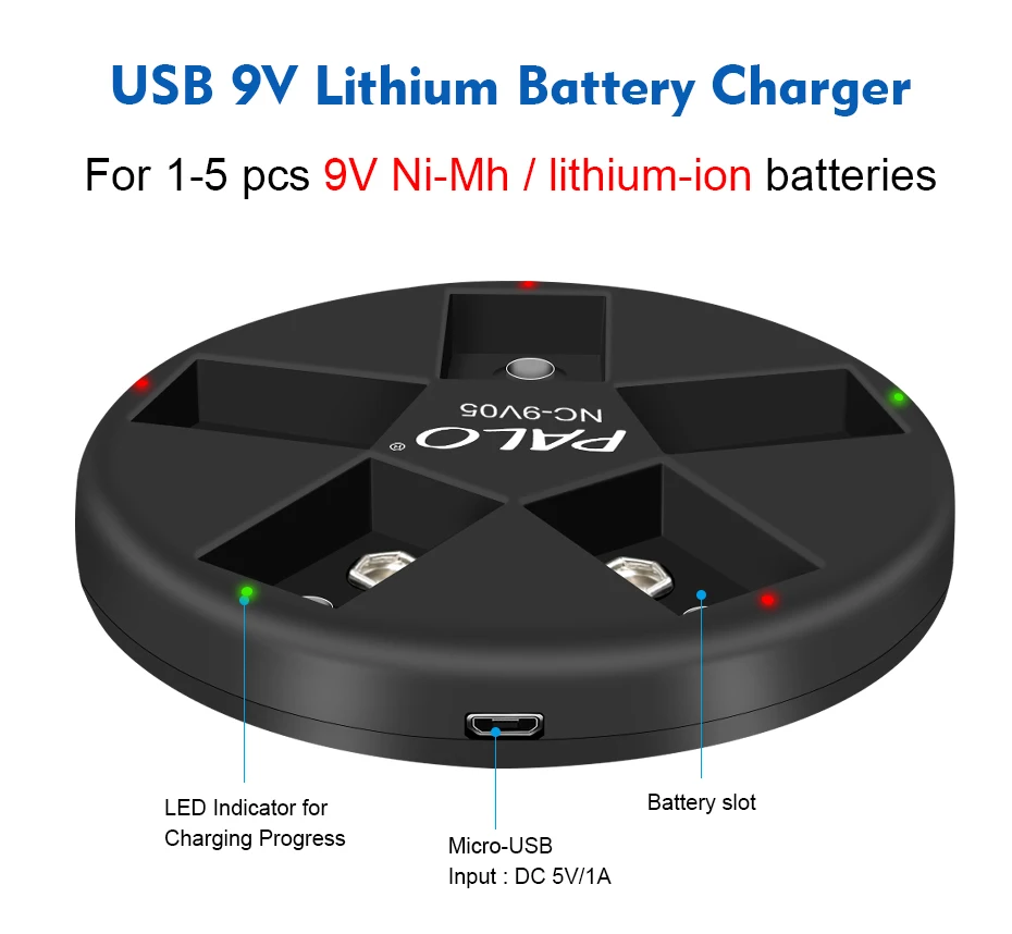 PALO 9V Li-ion Ni-MH Rechargeable Batteries Charger 5 slots usb charger fit for 9V lithium nimh nicd 6F22 Rechargeable Battery