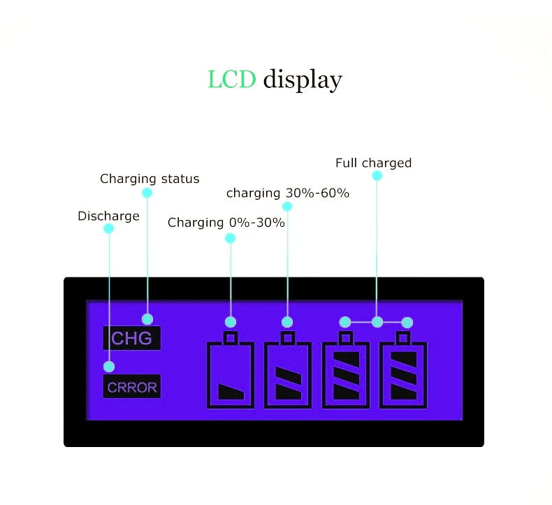 8. Automatic recognition function: unique algorithm to detect bad or defective battery, automatically detect non-chargeable or disposable battery and cease charging.