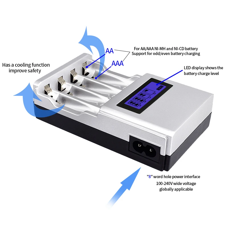 1.This charger can charge 1-4pcs 1.2V AA/AAA Ni-MH/Ni-CD rechargeable battery;