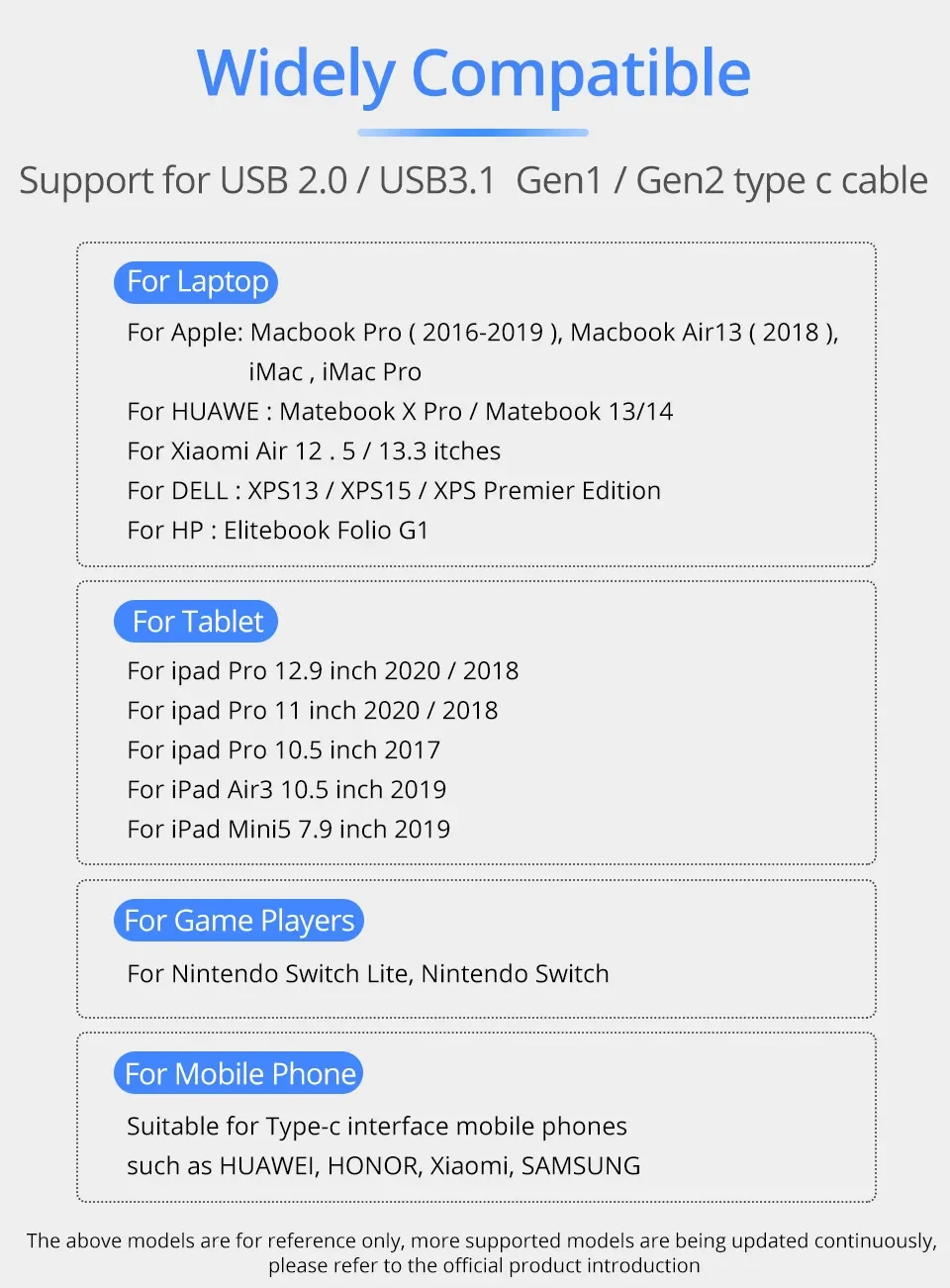 Support for USB 2.0 / USB3.1 Gen1 / Gen2 type c cable