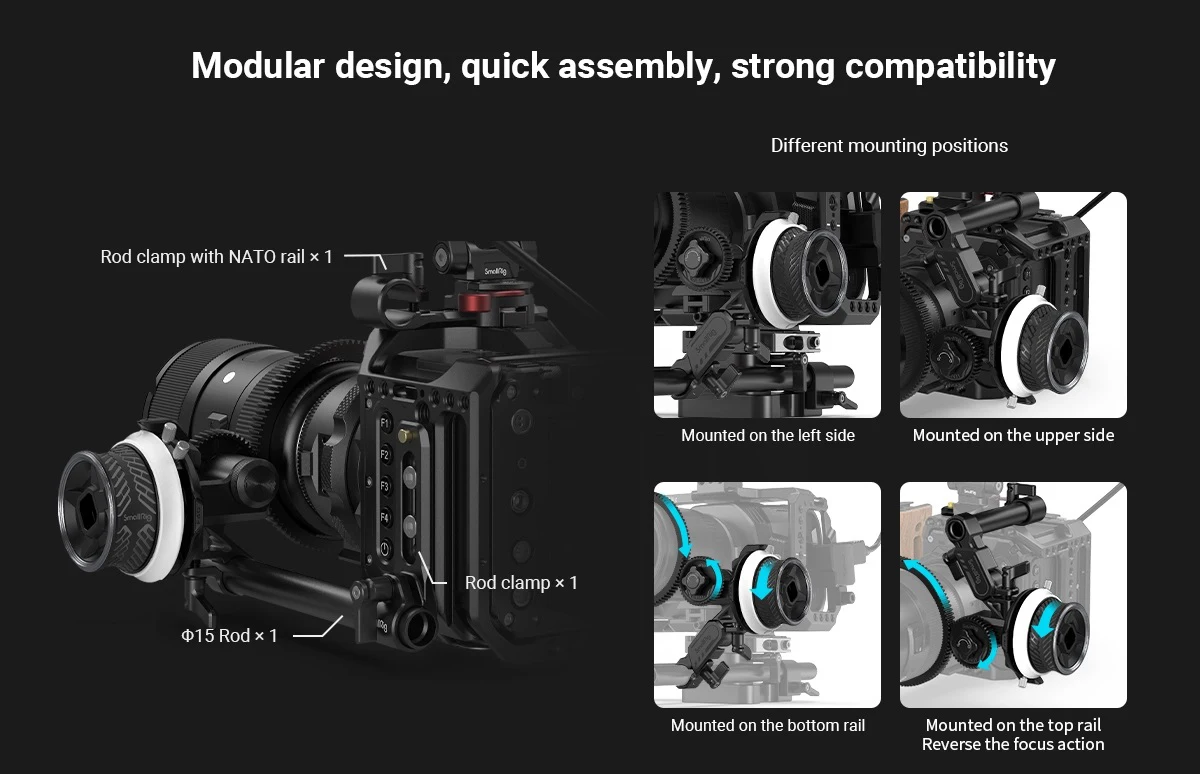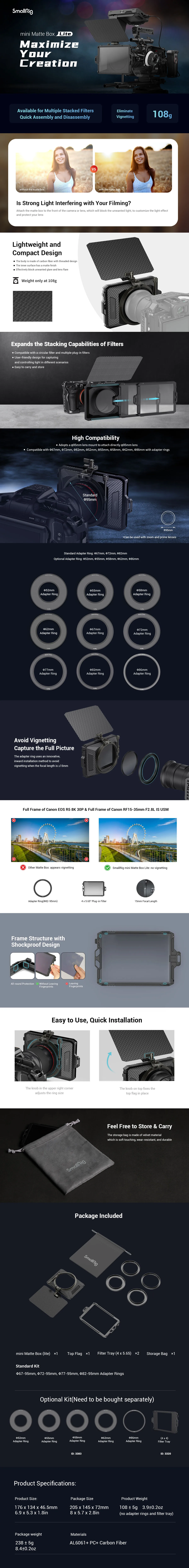 SmallRig Mini Matte Box Lite 3575is designed for DSLRs and mirrorless cameras to prevent sunlight or other light from causing glare and flare and to control images on the screen. Its clamp connector works with adapter rings of various sizes (Φ52-95mm; Φ55-95mm; Φ58-95mm; Φ62-95mm; Φ67-95mm; Φ72-95mm; Φ77-95mm; Φ82-95mm; Φ86-95mm) or attached directly to Φ95mm lens; its adapter ring fits CPL, ND filter and other circular filters of up to Φ92.5mm. Using filter tray (ID: 3319/3320) can quickly install with 4 x 5.65;/4 x 4; plug-in filters of 4mm in thickness. Easy-to-store filter tray (ID: 3319/3320), which can be quickly mounted onto the matte box via a NATO clamp, supports multiple 4 x 5.65;/4 x 4; plug-in filters of 4mm in thickness at the same time, protects filters from accidental drops and prevents scratches and fingerprints while replacing plug-in filters. The adjustable carbon-fiber top flag blocks sunlight or strong light and also prevents internal reflections with its anti-reflective design.