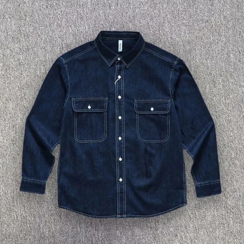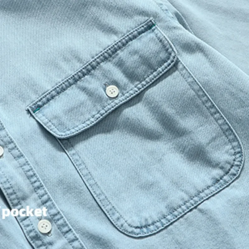Heavyweight Washed Cotton Workwear Denim Shirt for Men Motorcycle Style Loose Fit Button Down Cargo Shirt with Chest Pocket