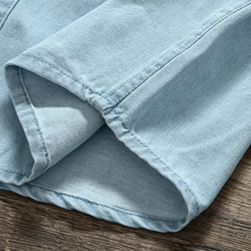 Men’s summer blue short-sleeved denim shirt. Regular size. Casual, trendy street style.