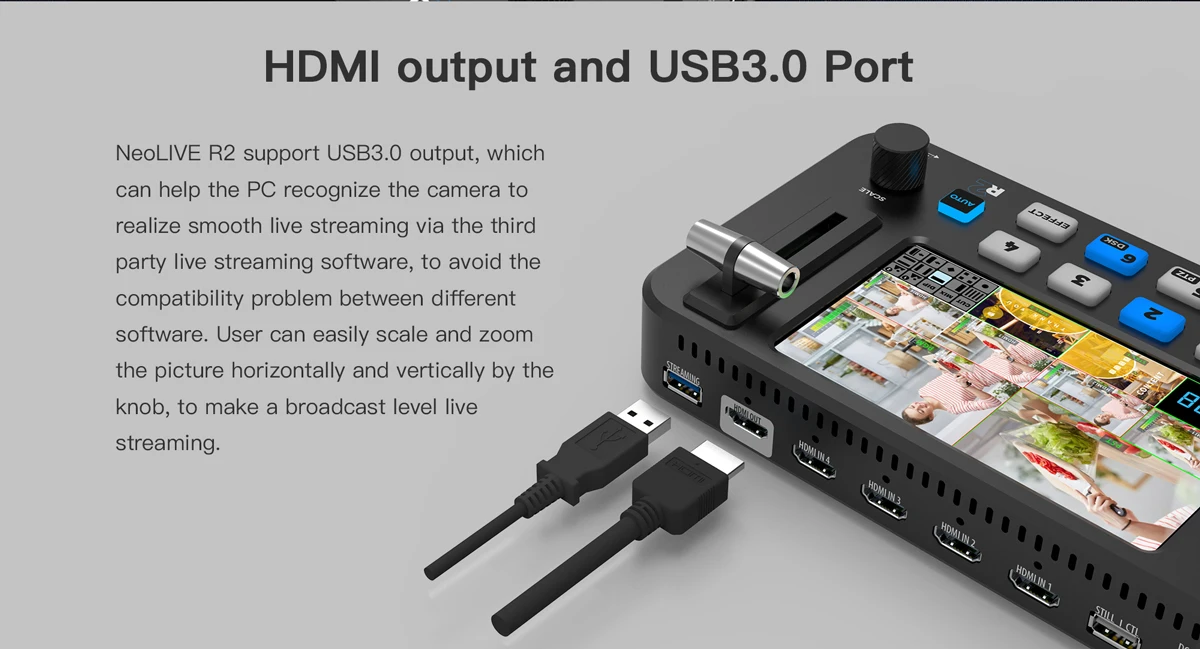 NeoLIVE R2 supports 4 HDMI inputs and 1 HDMI output, as well as a USB3.0 out for live streaming and USB STILL CTL for upgrade and picture insertion. On the side of the device there is audio input and output, and a LAN port for remote control.