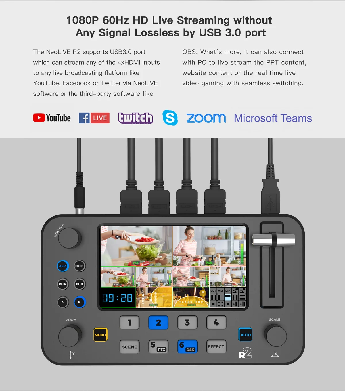 NeoLIVE R2 also features a USB3.0 output, which can help the PC recognize the camera to realize smooth live streaming via third party live streaming software, to avoid the compatibility problems.Both the HDMI and USB 3.0 port can be set to the HDMI1/2/3/4/PST/PGM/PVW channel to meet the variety of live streaming and live show use.