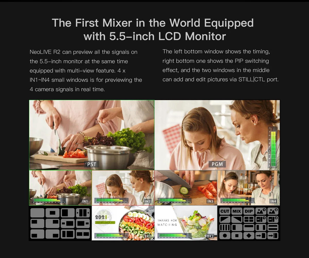 NeoLIVE R2 can preview all the signals on the 5.5-inch monitor at the same time with the multi-view feature. 4 small windows are for previewing the 4 camera signals in real time.The left bottom window shows the timing, right bottom one shows the PIP switching effect, and the two windows in the middle can add and edit pictures via STILL/CTL port.