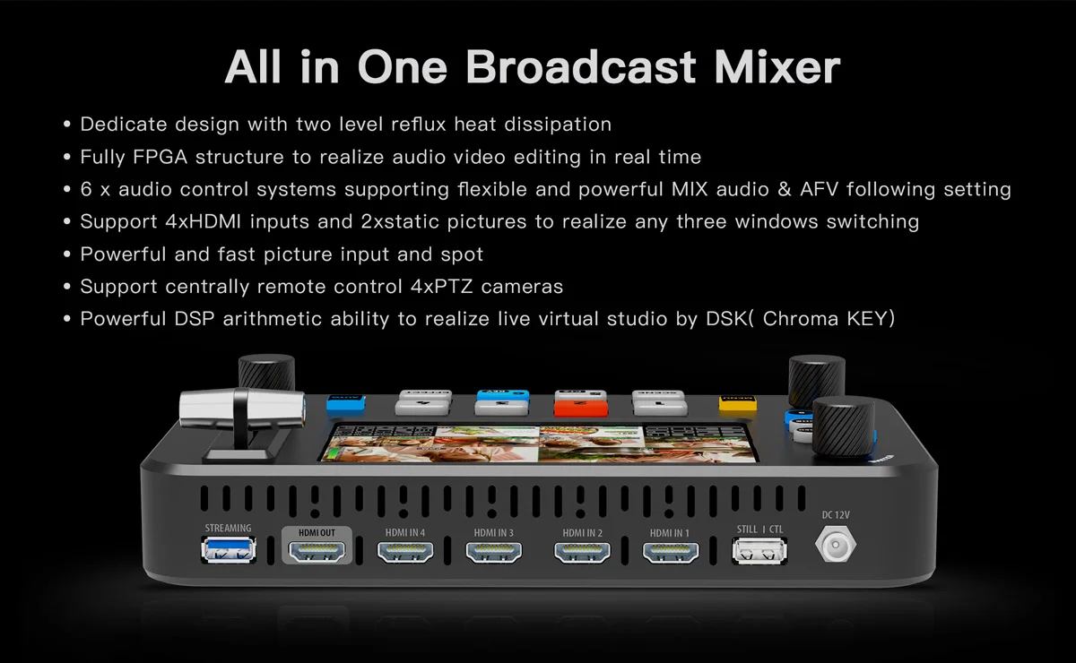 A dedicated and pro video mixer, the Sprolink NeoLIVE R2 is designed offer simple live 4 camera switching and streaming while offering a 5.5-inch LCD monitor for 10 windows & multiview. Users can quickly select the input source, add or delete a layer, move layers horizontally or vertically, Scale and ZOOM. Other features include audio settings like mix, AFV follow, audio lock and Save and Load. Great PTZ control, Chroma Key, and Transition effects, and other menu settings round things out. The big button design provides a user-friendly experience allowing you to easily and successfully finish the tasks at hand.