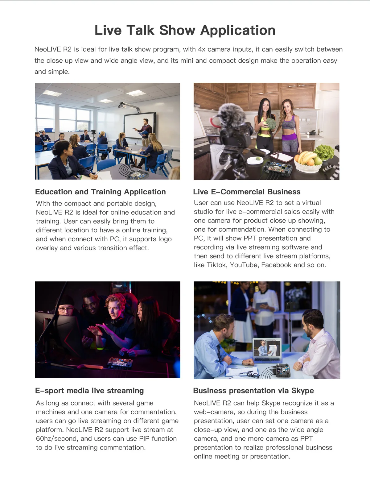 The user can use NeoLIVE R2 to easily set up a virtual studio for live e-sales, with one camera showing the product and one for the sales commentary. When connected to a computer, it can show graphic presentations and also record via third-party livestreaming software such as Tiktok, YouTube, Facebook, and more. You can also use it as a P2P webcam for a video presentation or meeting with applications such as Skype and Zoom.
