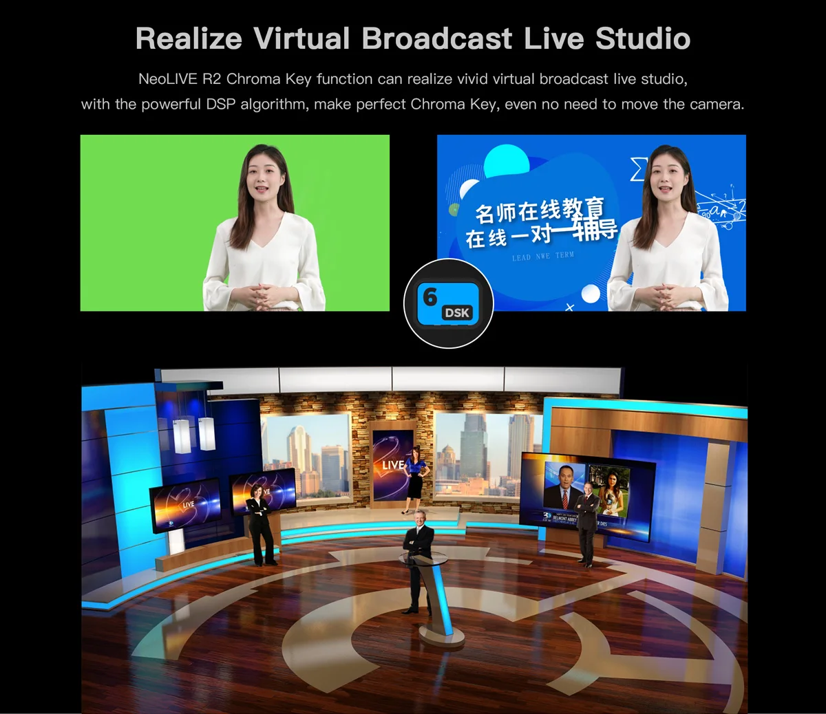 The NeoLIVE R2 Chroma Key function can help you to create a vivid, virtual live broadcast studio, with the powerful DSP algorithm and Chroma Key. No need to move the camera.