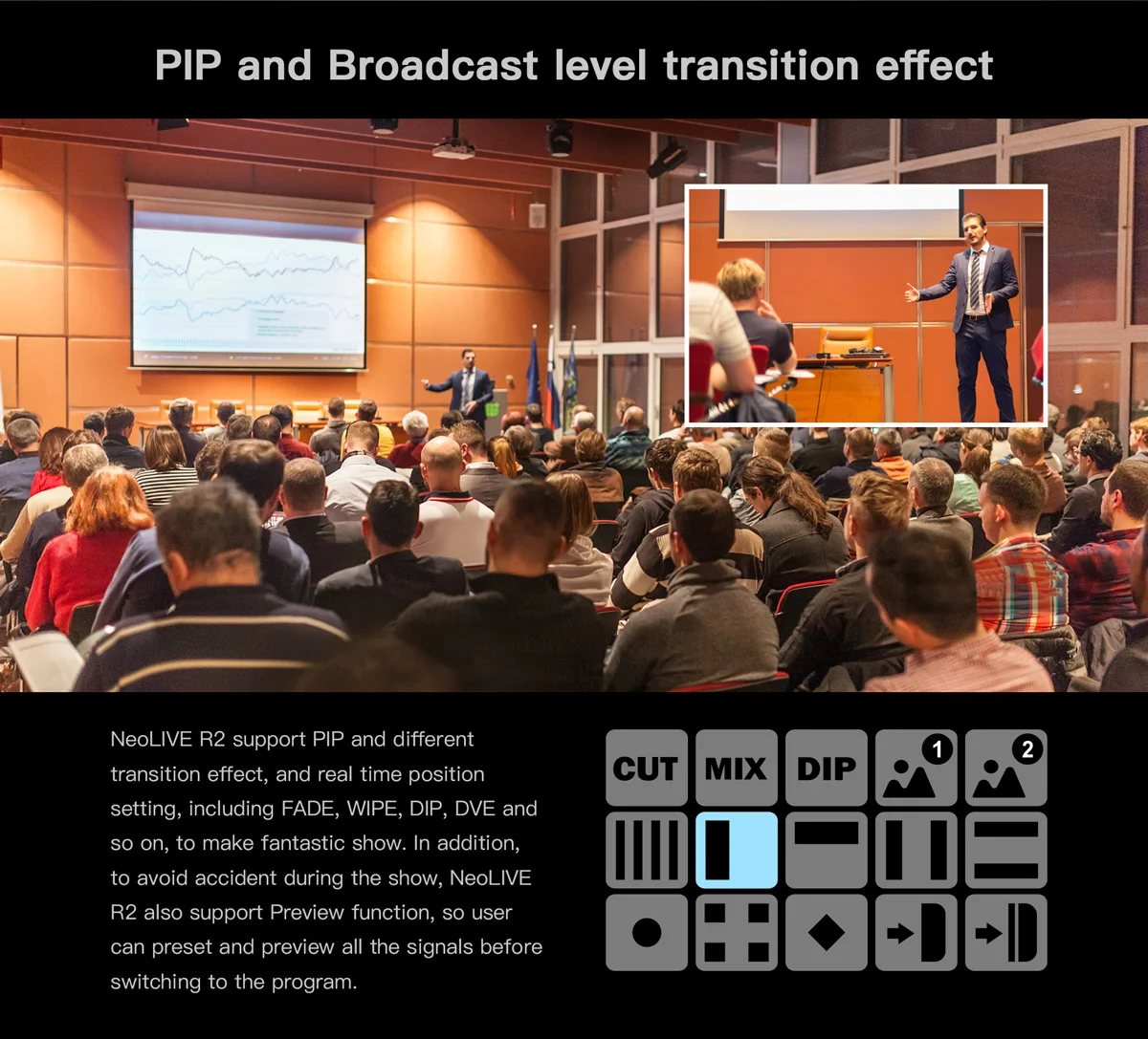 NeoLIVE R2 support PIP and different transition effects and real time position settings including FADE, WIPE, DIP, DVE to create a fantastic show. In addition NeoLIVE R2 also has a Preview function so you can preset and preview all the signals before switching to the program.