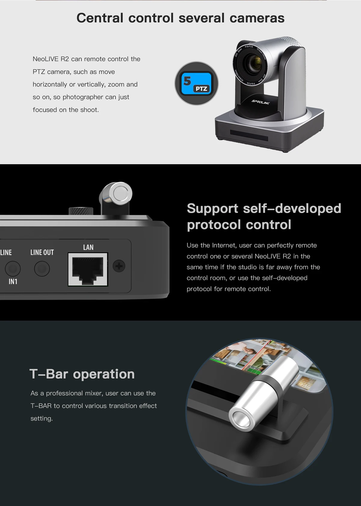 NeoLIVE R2 is a dedicated and professional mixer and signal switcher, which is the first in the world that built-in 5.5-inch LCD monitor for 10 windows & multi-view. With USB 3.0 port, it is able to stream any 4 camera signals to any live streaming platform via SPROLINK NeoLIVE software or the third-party software like OBS and realize 1080P display without any signal lossless. What’s more, through NeoLIVE R2 unique STILL|CTL port, users can add and edit picture, and connect with PC to present PPT or live Gaming interface during the live streaming. NeoLIVE R2 also support PIP function and can meet most live streamingapplications with the broadcast level functionality.