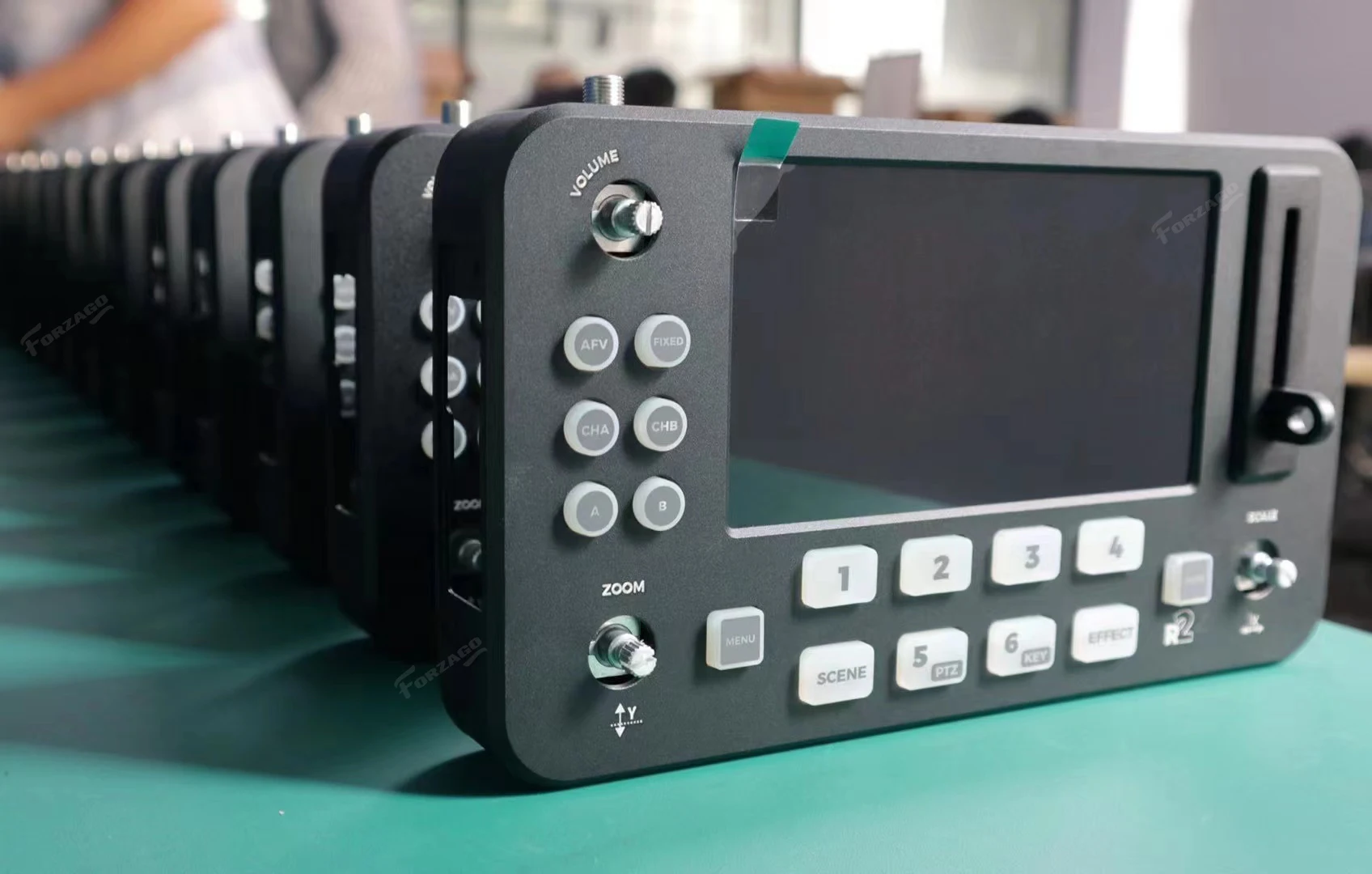 NeoLIVE R2 design simply and convenient onboard buttons and knob, users can quick select the input source, add or delete the layer, move layer horizontally or vertically, Scale, ZOOM, audio setting like mix, AFV follow, audio lock, Save and Load, PTZ control, Chroma Key, and Transition effect, and other menu setting. The big button design provide user-friendly operation experience, and user can easily and successfully finish