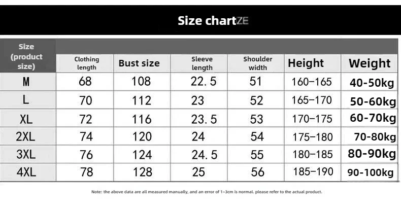 2XL weight70-80kg, 3XL weight80-90kg, 4XL weight90-100kg, L weight50-60 kg, M weight40-50kg, XL weight60-70 kg
