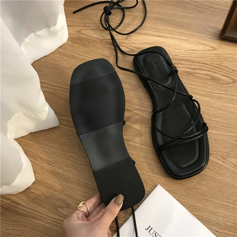 Summer Slippers Women Sandals Narrow Vintage Square Toe Flat Cross Strap Thong Sandals V Shape Design Shoes Women Plus Size43