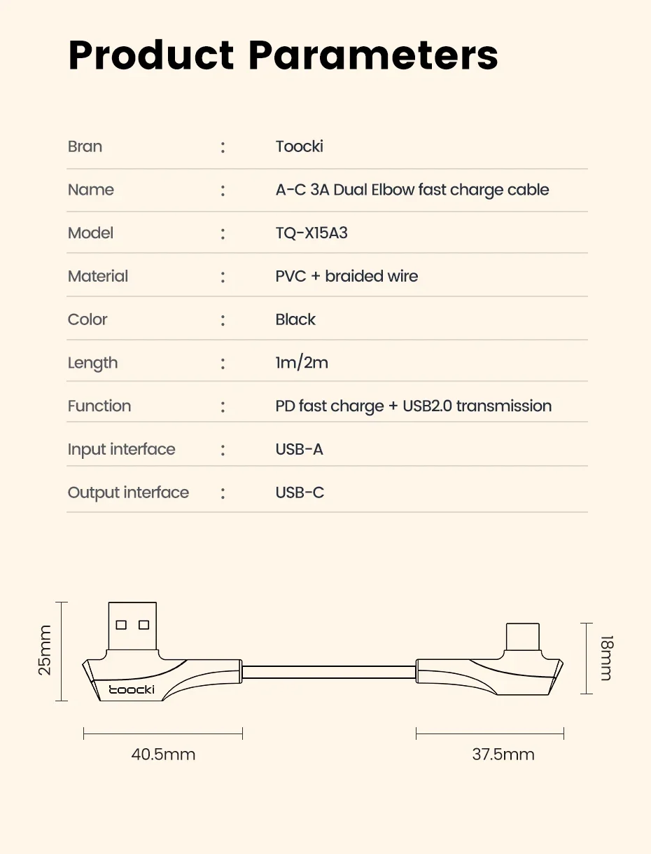 Toocki Double Elbow USB Type C Cable 3A Fast Charging 90 Degree USB C Cable For Xiaomi Samsung Huawei LG Data C Type Game Cord