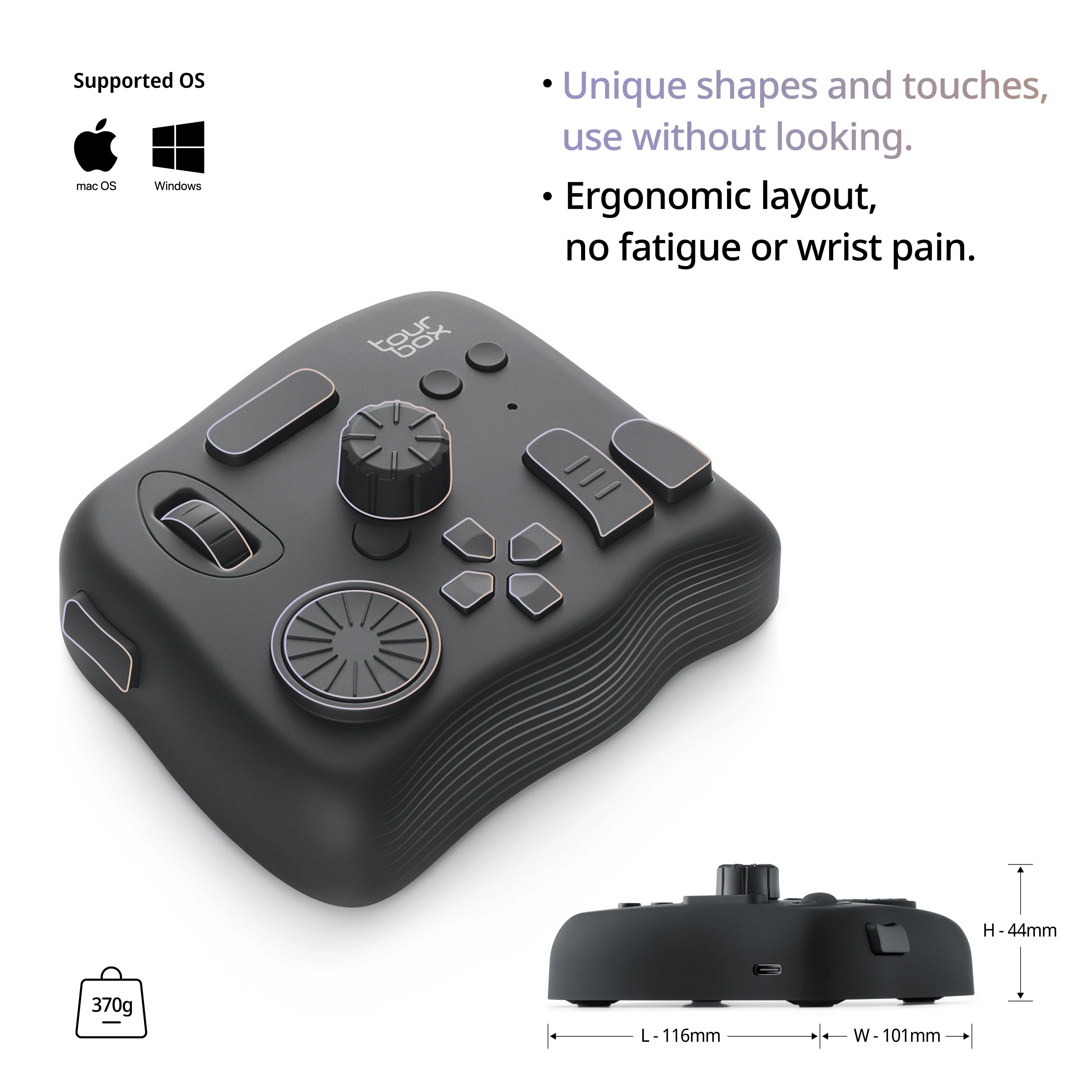 The controller is compatible with Mac and Windows operation systems and connects to your computer by a USB-C to A cable, powered from your computer. It has a compact and ergonomic design with an outer material which is comfortable to touch.