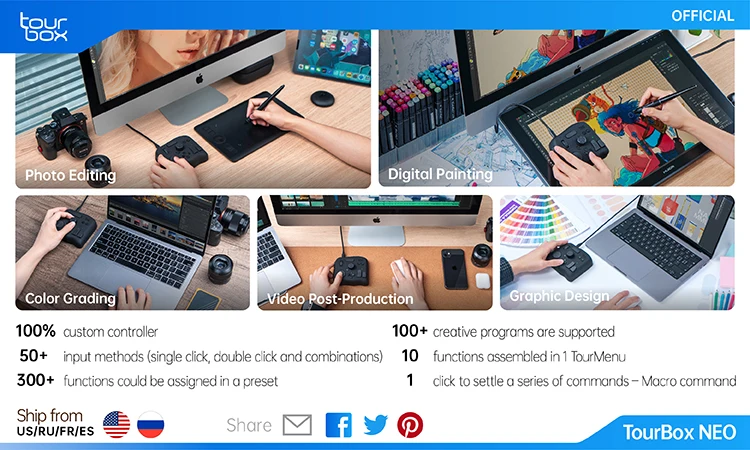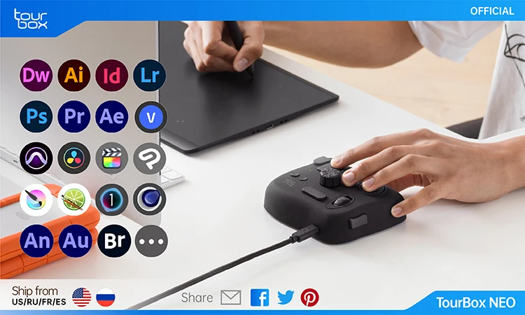 Say goodbye to all those tedious operations, TourBox NEO brings you back to creativity itself. Whether you are working with Photoshop, Lightroom, Illustrator, Capture One, Clip Studio Paint, Comic Studio, PaintTool SAI, Final Cut Pro X, Premiere, After Effects, DSC, or other software, TourBox NEO is the perfect solution for you. Premiere, After Effects, DaVinci Resolve, Audition, Cinema 4D, etc., your workflow will no longer be interrupted and you can enjoy the joy of a real productivity tool.