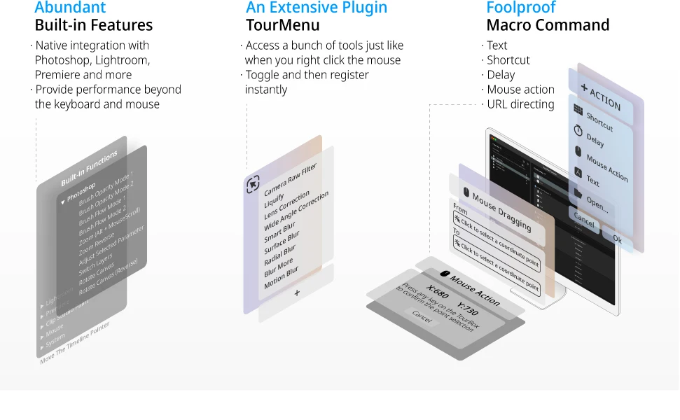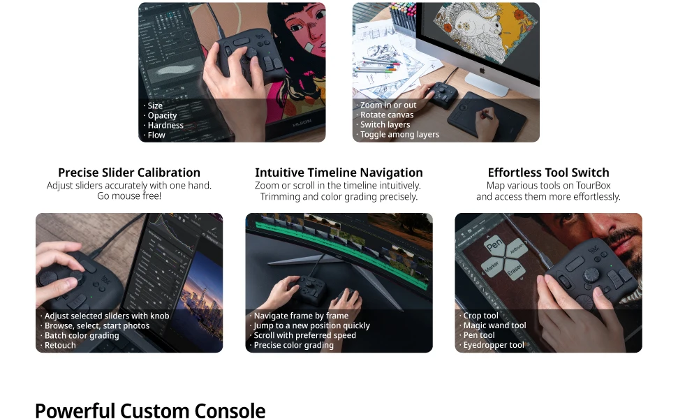 • 【EXTENSIVELY CUSTOM CONSOLE】TourBox is much more than a shortcut keyboard with its powerful Console developed by TourBox Tech.: 1. Tons of exclusive built-in features. 2. Auto-switch: Allows you to manage multiple presets and automatically switch to the corresponding preset. 3. Macro command: Configurable actions include keyboard shortcuts, mouse action, delay, text input, file and folder opening, and link directing. 4. TourMenu: Store over 10 actions under 1 single button.