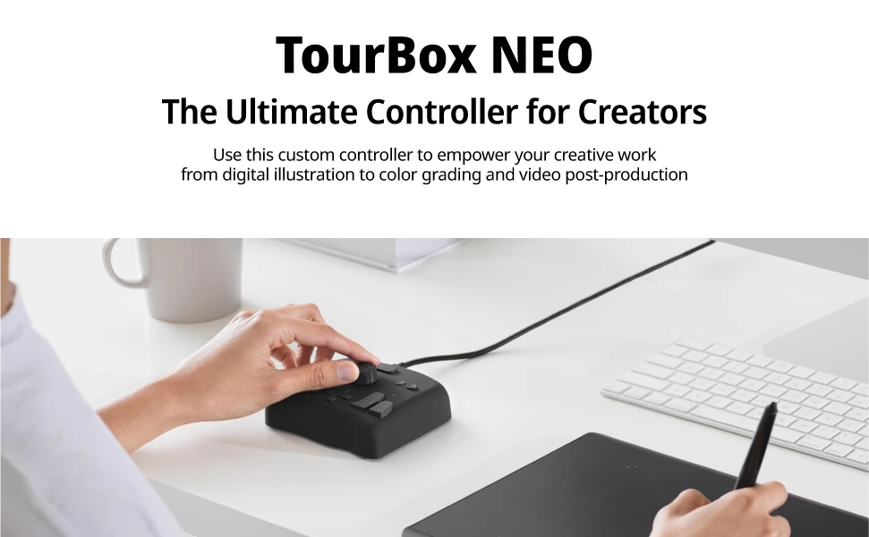 The TourBox NEO Ultimate Creative Software Controlleris an upgraded customizable creative software controller made by TourBox Tech Inc. The new generation of components makes all operations more accurate; the right damping makes all the rotation operations natural. Combined with the latest version of TourBox Console, TourBox NEO offers an unprecedented experience in painting, design, photo & video editing, and audio editing.