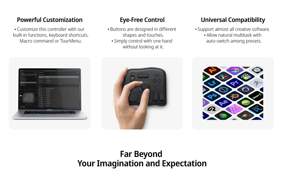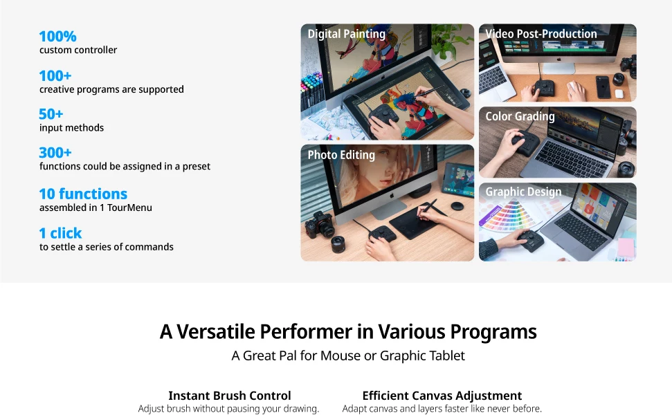 • 【WIDE HARDWARE & SOFTWARE COMPATIBILITY】TourBox operates with all Mac and Windows programs that rely on keyboard shortcuts, such as Photoshop, Lightroom, Premiere-edit and Premiere-color, Illustrator, Premiere Pro, DaVinci Resolve, Final Cut Pro X, Clip Studio Paint, Camera Raw, Capture One Pro, Paint Tool SAI, you name it!