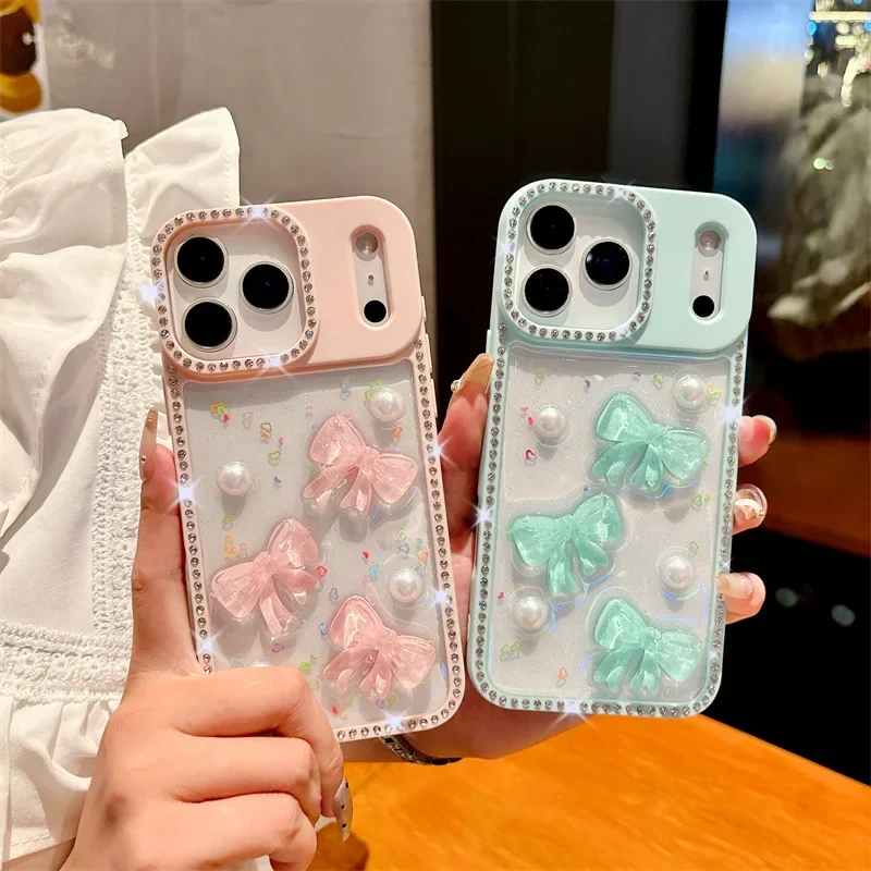 Transparent Candy Glitter Bling Flash Diamond Cute Bow Phone Cases For Apple iPhone 17 Air 16 15 14 13 Pro Max Shockproof Cover
