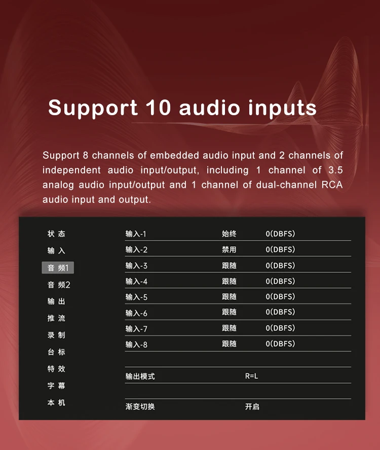 Output Interface | PMG SDI 2 channels PGM HDMl 1 channel Multi-screen output 1 channel Audio monitor 1 channel Analog audio output 2 channels 1 Tally output (8 channels two-color) |