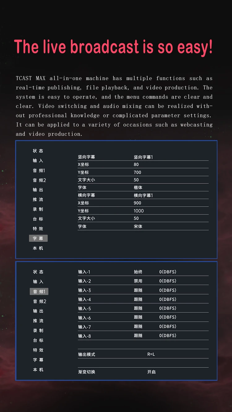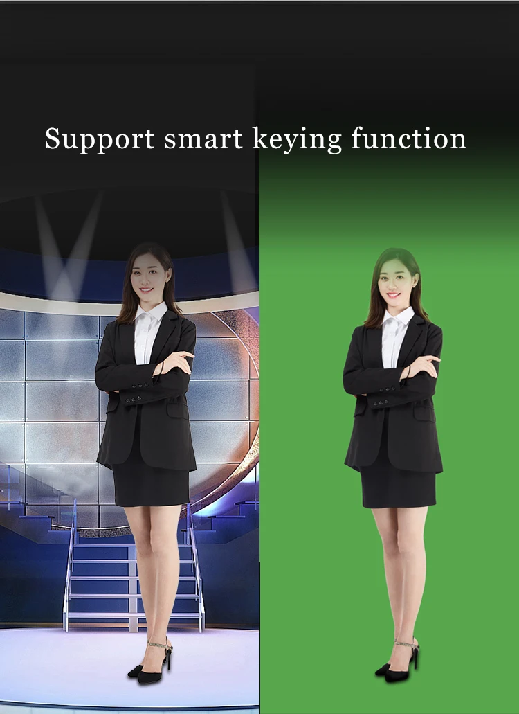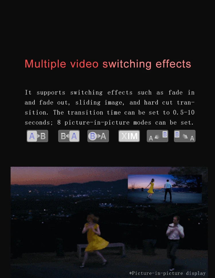 Transition effect | Support 6 kinds of transition effects and picture-in-picture, the transition effect time can be set between 2-10s, and the size and position of the picture-in-picture can be set in the background. |