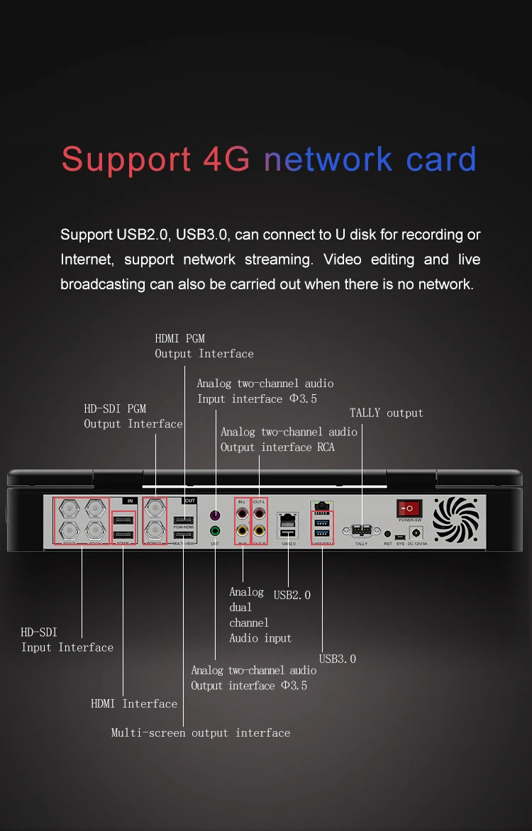 input Interface | 3G/HD SDI 4 channels, HDMl 2 channels, Network stream input 2 channels, Analog audio input 2 channels |