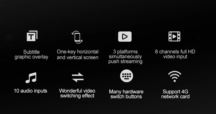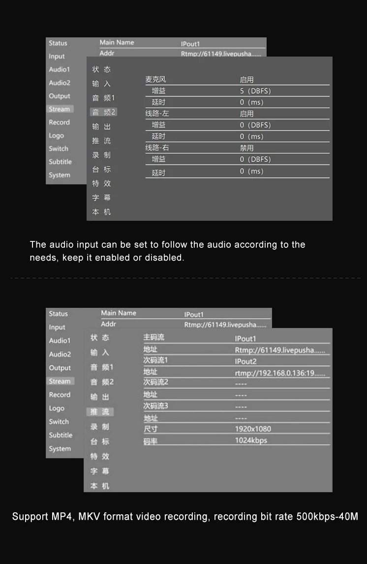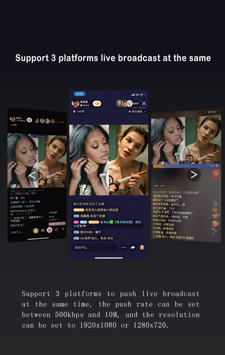 live streaming | Support 4 platform push streaming live broadcast, support push streaming address preset up to 24, The resolution can be 1280×720,1920×1080, Code rate: 500kbs~10240kbs. |