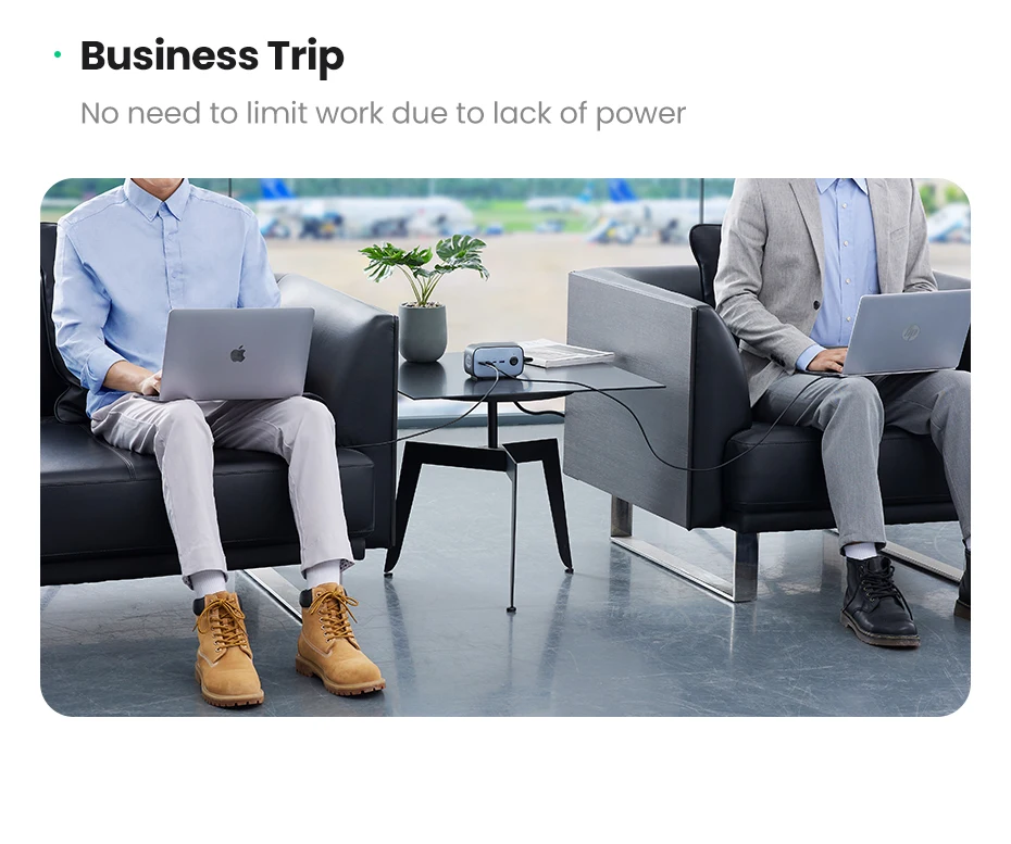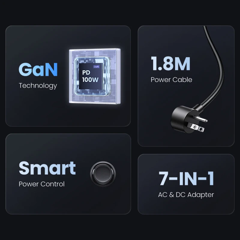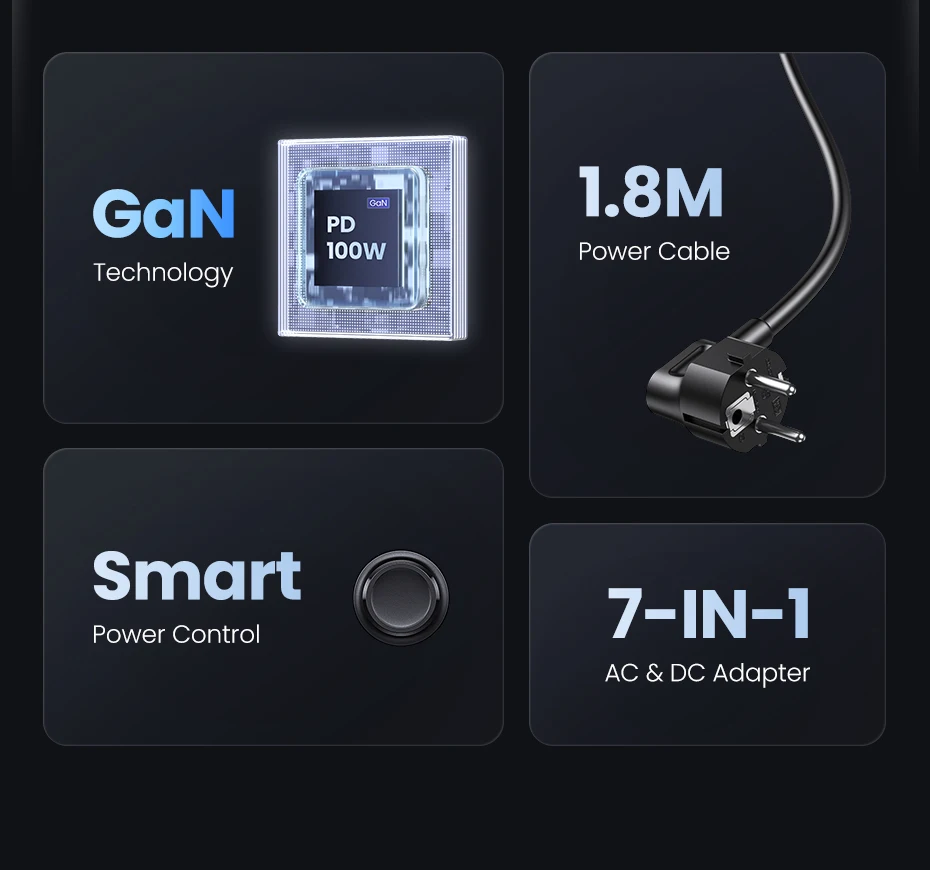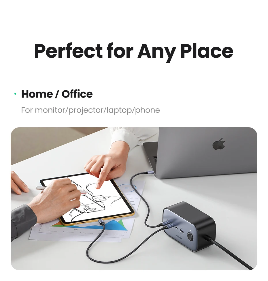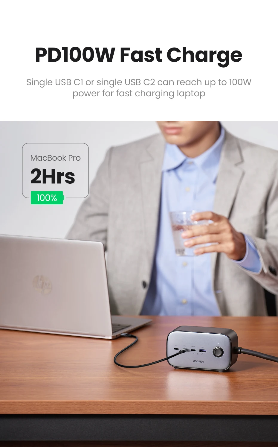 Ugreen 100W USB C GaN Charger provides super-fast speed to virtually any USB-A or USB-C mobile device, tablets and laptops. With 2 AC outlets, connect home appliances like projectors, monitors and more.